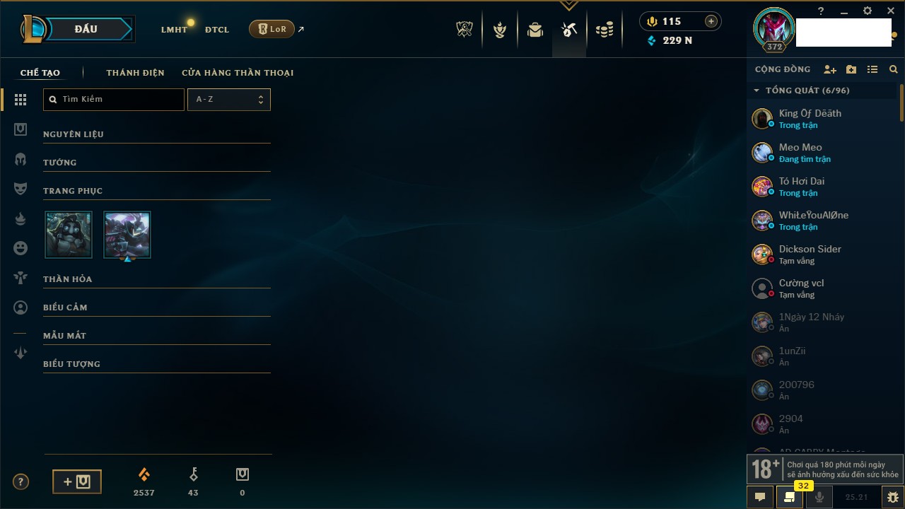 Rank Đơn: Bạch Kim IIIKhung: Bạch kimTướng: 171 - Còn 251383 THXTrang Phục: 229Rank ĐTCL: Sắt IILinh Thú: 51
