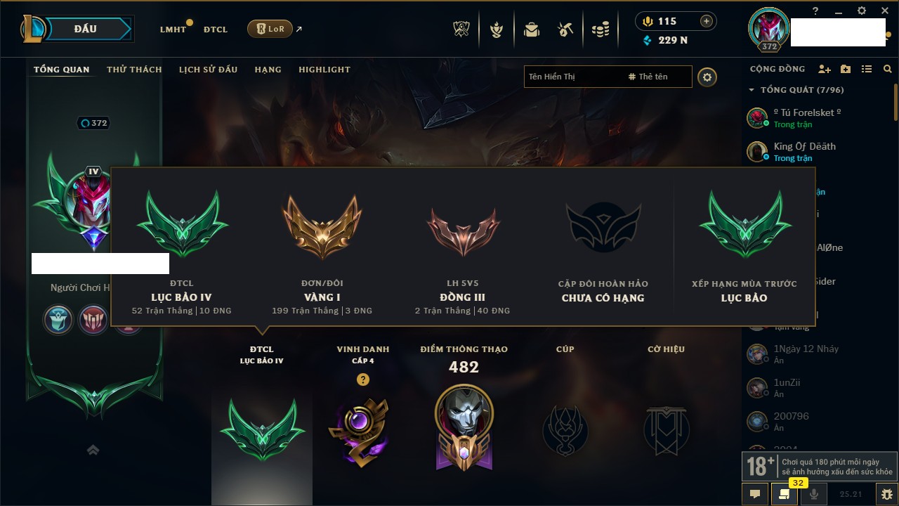 Rank Đơn: Bạch Kim IIIKhung: Lục BảoTướng: 172 - Còn 453285 THXTrang Phục: 220Rank ĐTCL: Chưa RankLinh Thú: 104