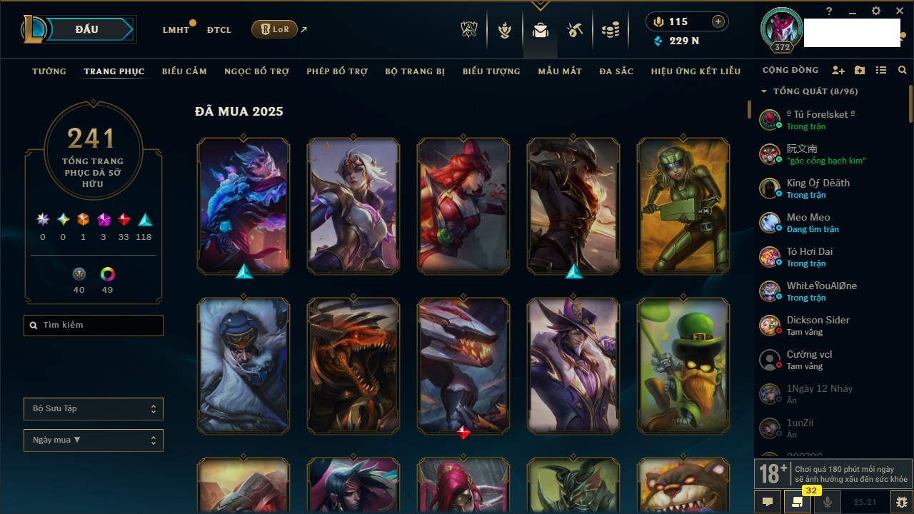 Rank Đơn: Vàng IIIKhung: VàngTướng: 171 - Còn 88128 THXTrang Phục: 329Rank ĐTCL: Chưa RankLinh Thú: 41