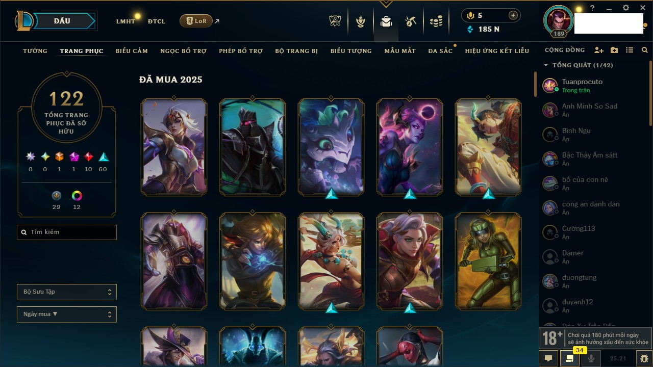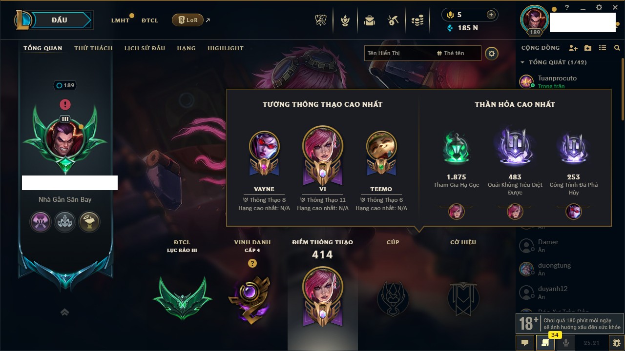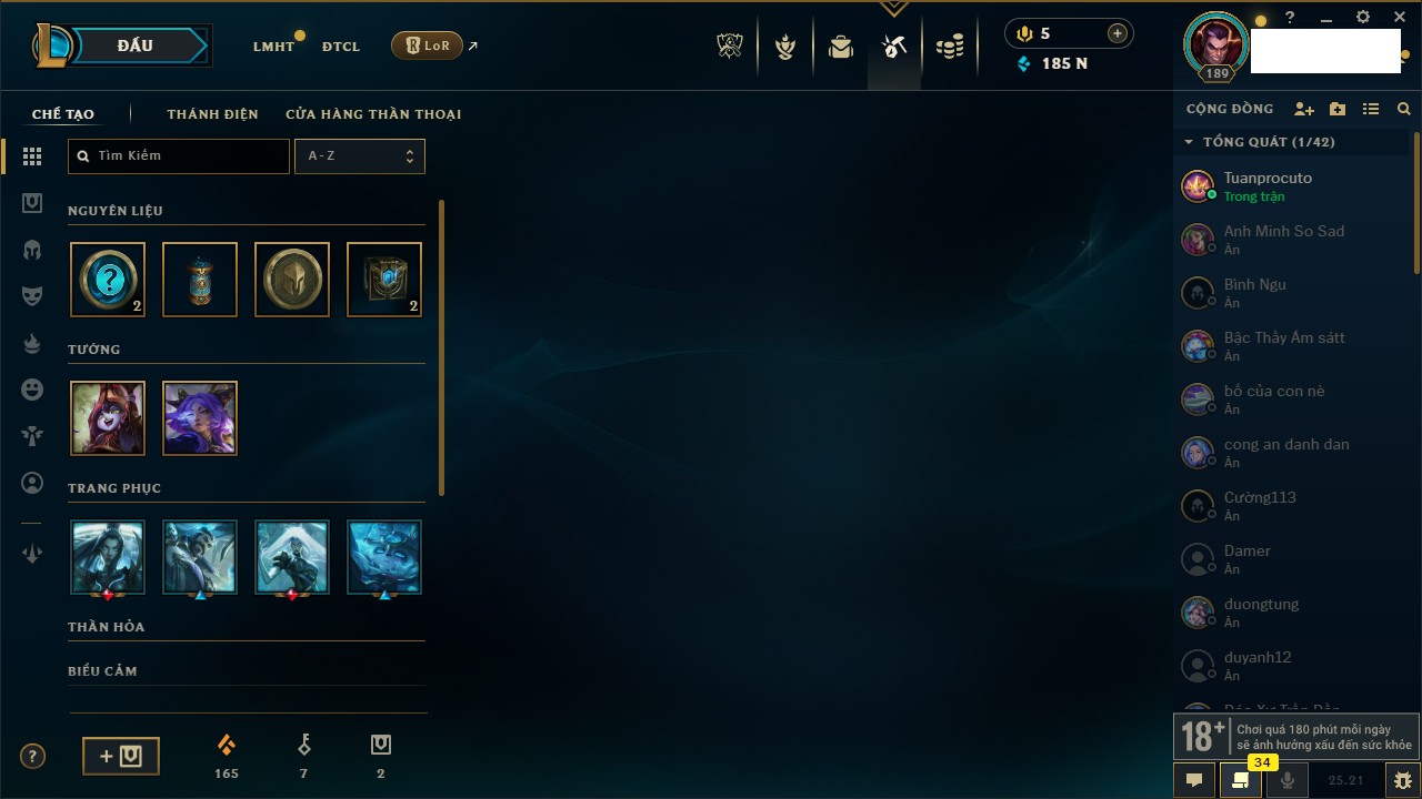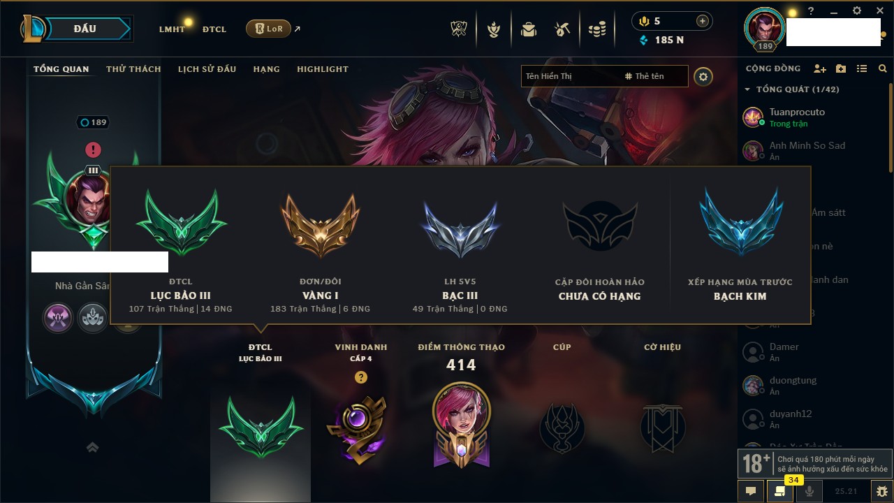 Rank Đơn: Vàng IIIKhung: BạcTướng: 171 - Còn 101359 THXTrang Phục: 88Rank ĐTCL: Kim Cương IVLinh Thú: 200