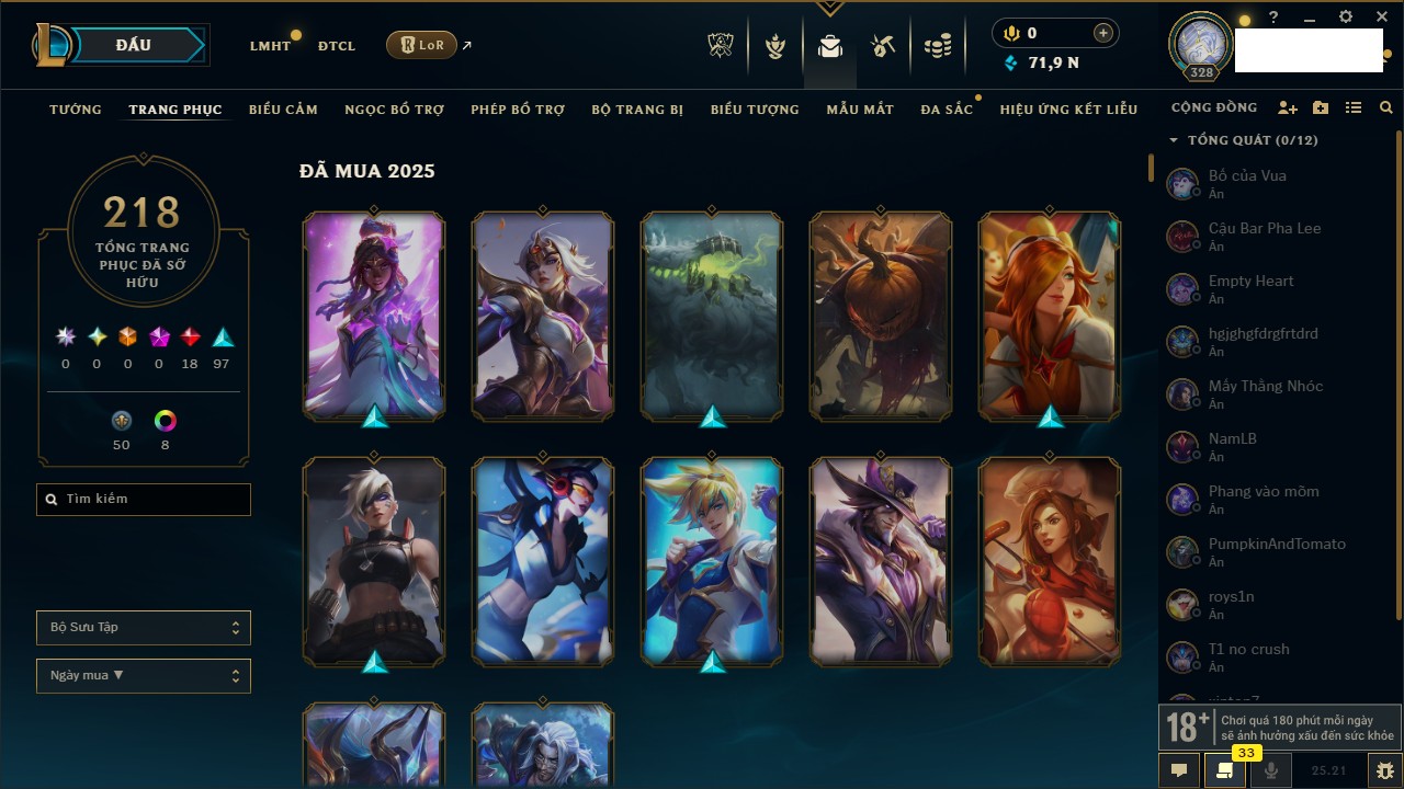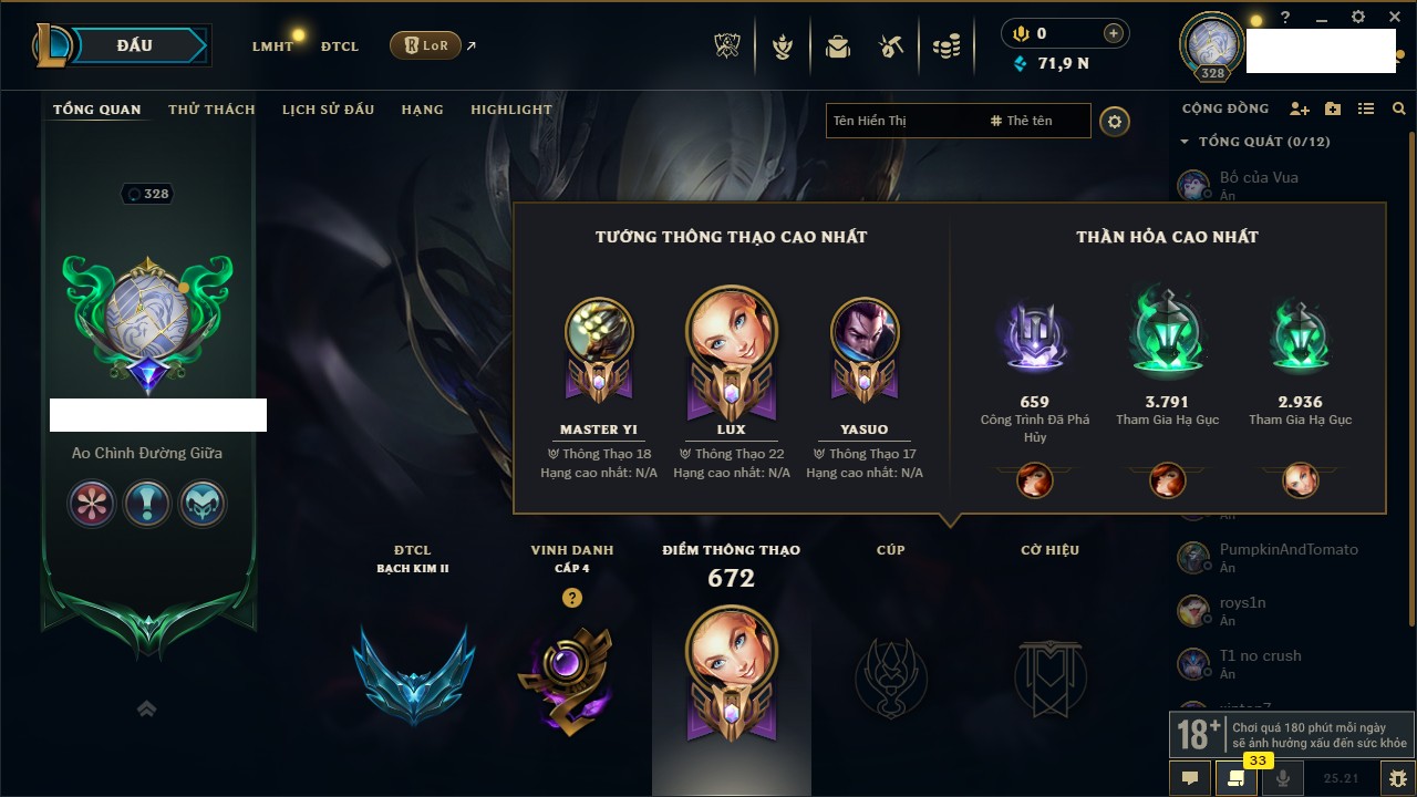 Rank Đơn: Bạch Kim IIKhung: Bạch kimTướng: 171 - Còn 316137 THXTrang Phục: 89Rank ĐTCL: Bạch Kim IIILinh Thú: 94