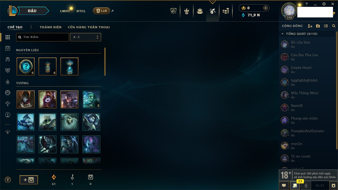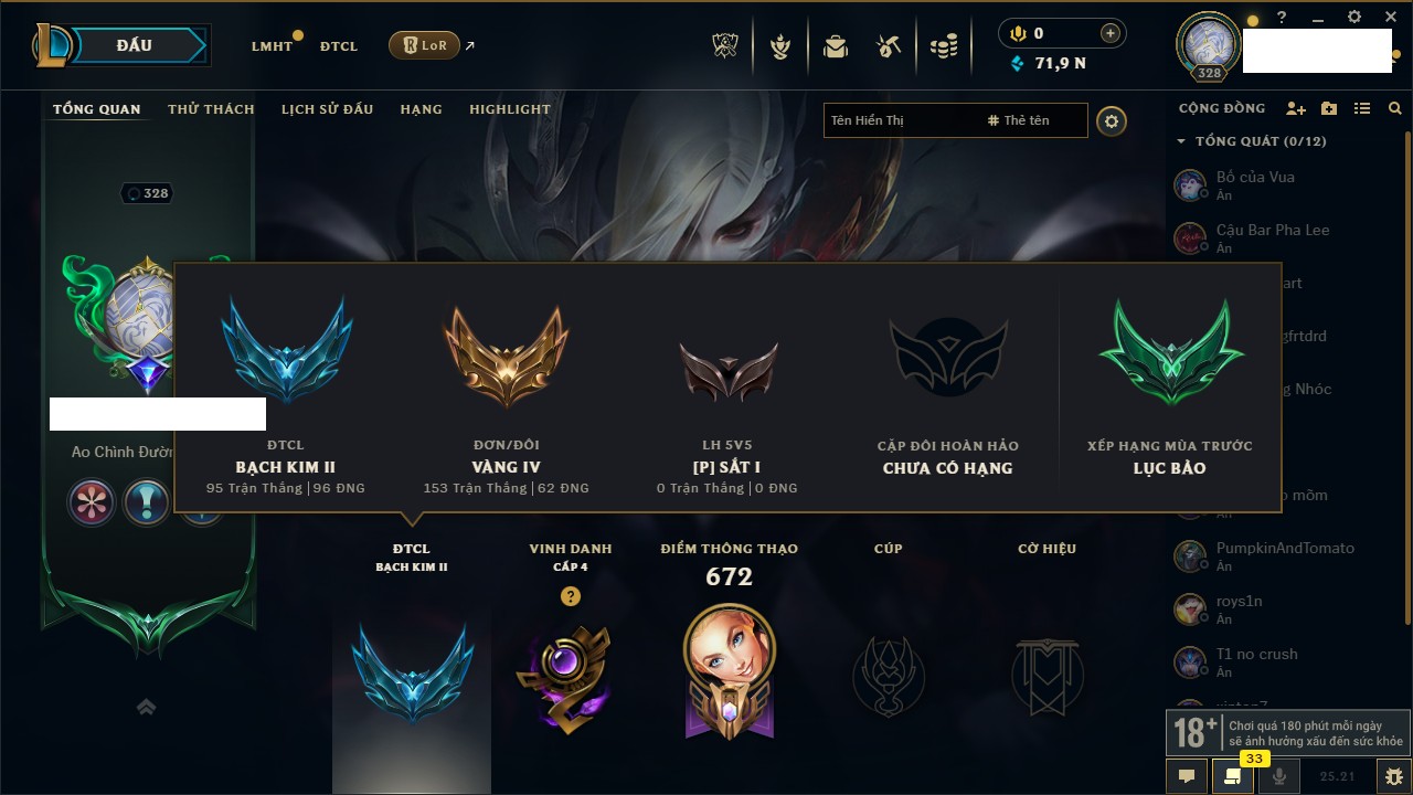 Rank Đơn: Lục Bảo IVKhung: VàngTướng: 171 - Còn 154648 THXTrang Phục: 203Rank ĐTCL: Bạch Kim IVLinh Thú: 69