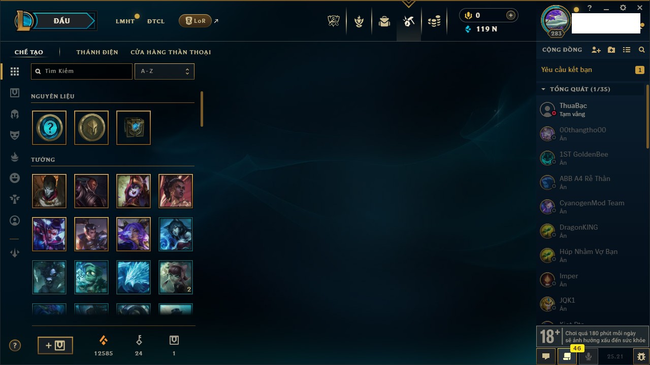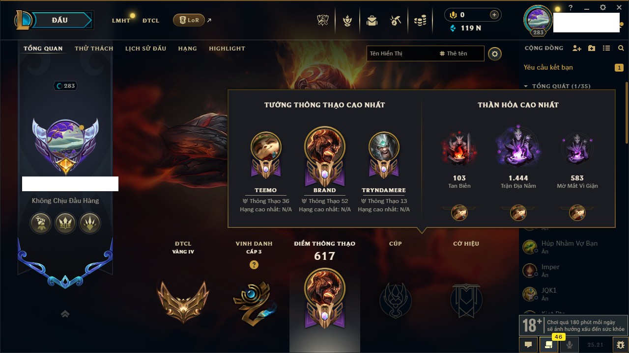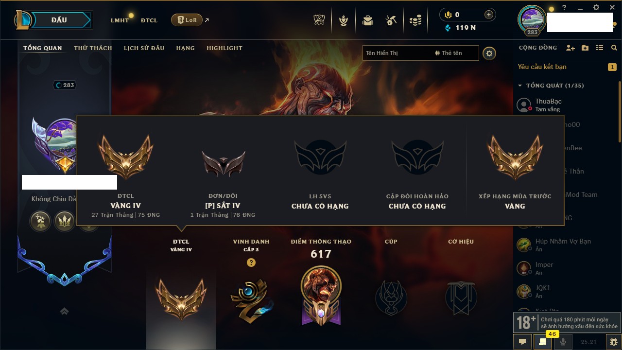 Rank Đơn: Lục Bảo IVKhung: VàngTướng: 171 - Còn 154648 THXTrang Phục: 203Rank ĐTCL: Bạch Kim IVLinh Thú: 69