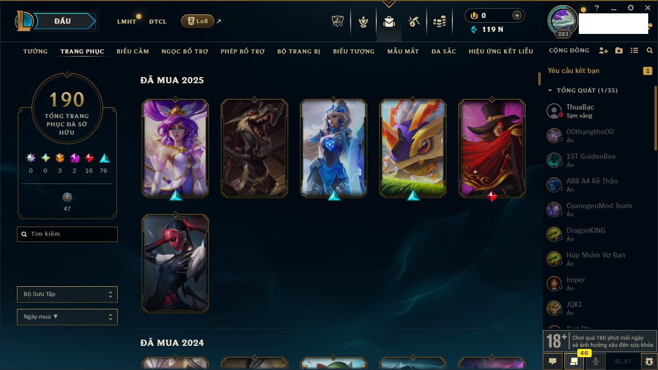 Rank Đơn: Bạc IIIKhung: BạcTướng: 171 - Còn 190352 THXTrang Phục: 260Rank ĐTCL: Sắt IILinh Thú: 31