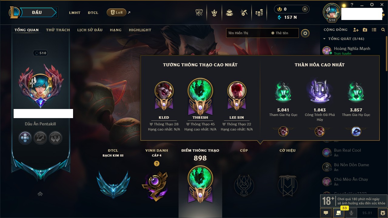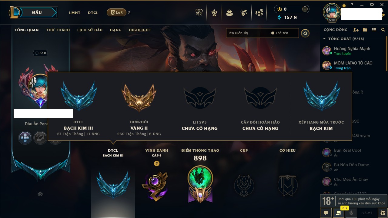 Rank Đơn: Bạch Kim IIKhung: Bạch kimTướng: 171 - Còn 316137 THXTrang Phục: 89Rank ĐTCL: Bạch Kim IIILinh Thú: 94