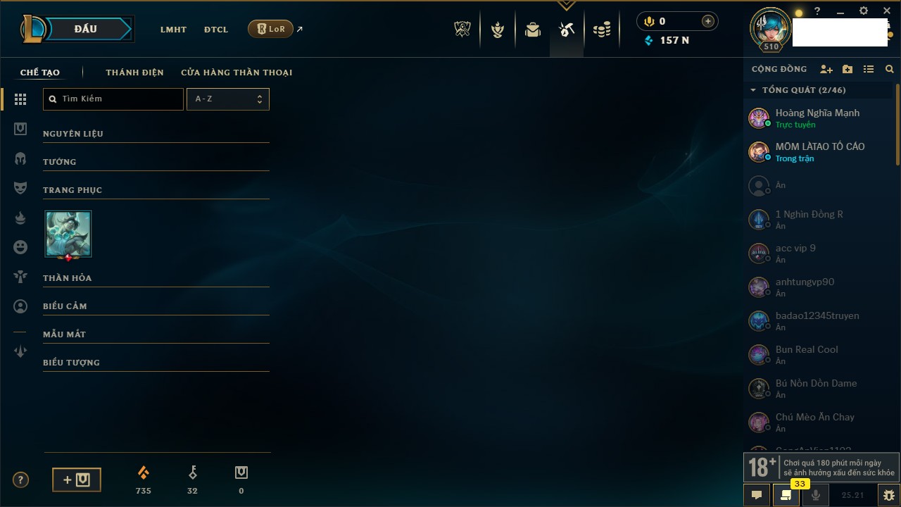 Rank Đơn: Lục Bảo IVKhung: VàngTướng: 171 - Còn 154648 THXTrang Phục: 203Rank ĐTCL: Bạch Kim IVLinh Thú: 69