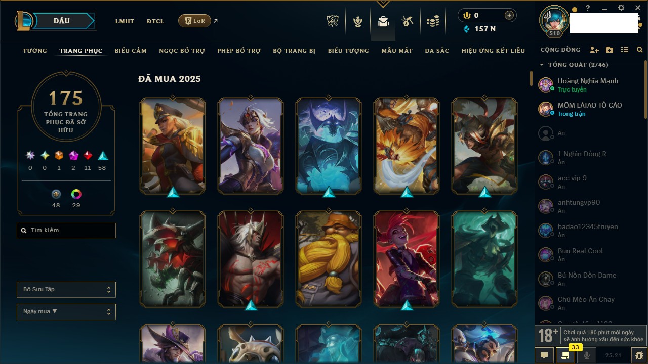 Rank Đơn: Vàng IIKhung: VàngTướng: 170 - Còn 243330 THXTrang Phục: 230Rank ĐTCL: Chưa RankLinh Thú: 68