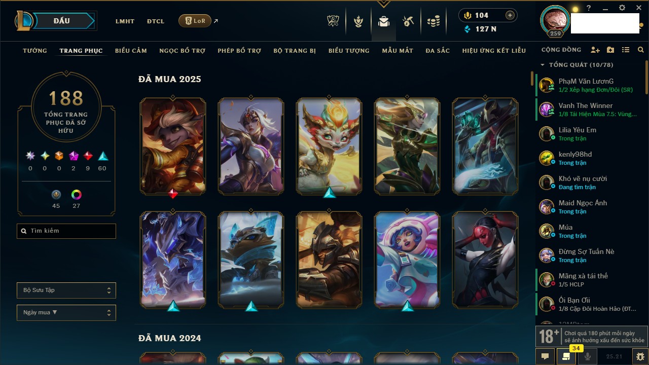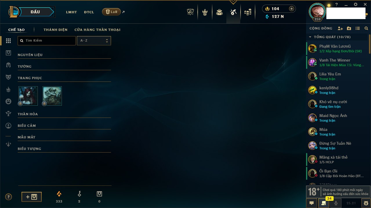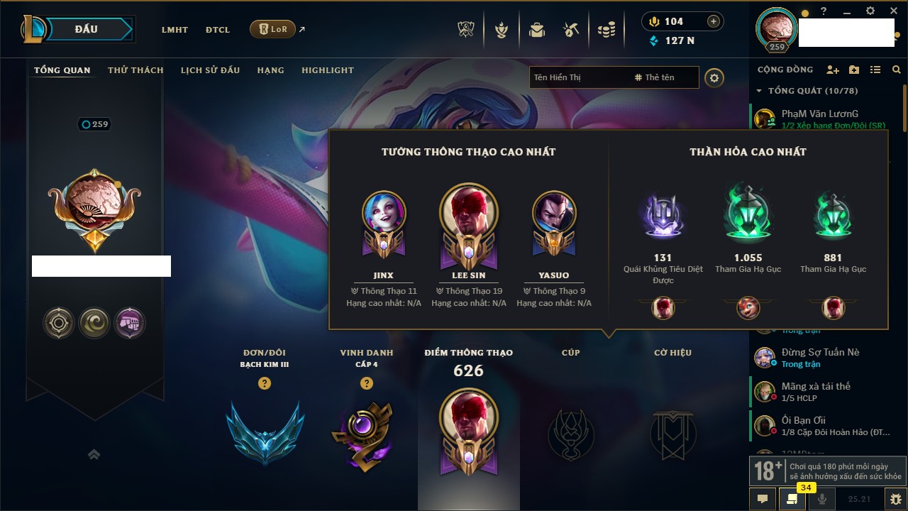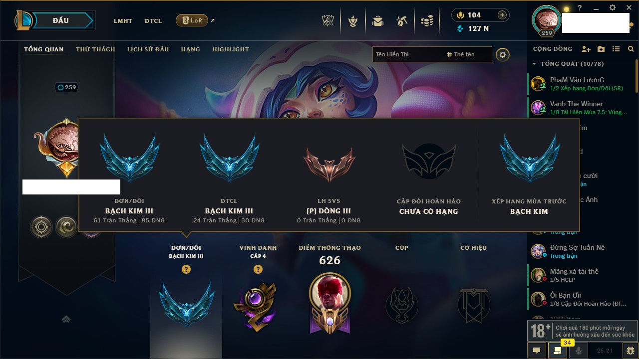 Rank Đơn: Vàng IIIKhung: BạcTướng: 171 - Còn 101359 THXTrang Phục: 88Rank ĐTCL: Kim Cương IVLinh Thú: 200