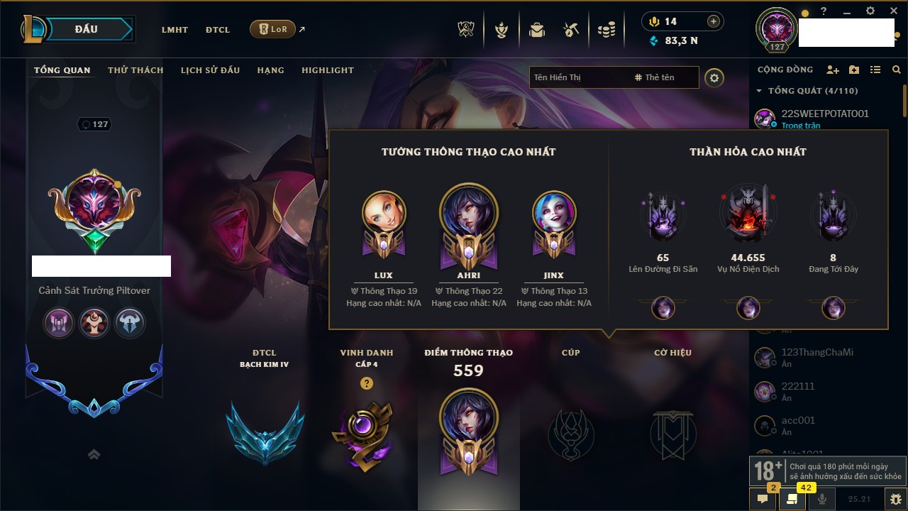 Rank Đơn: Bạch Kim IVKhung: Bạch kimTướng: 171 - Còn 54021 THXTrang Phục: 327Rank ĐTCL: Chưa RankLinh Thú: 115