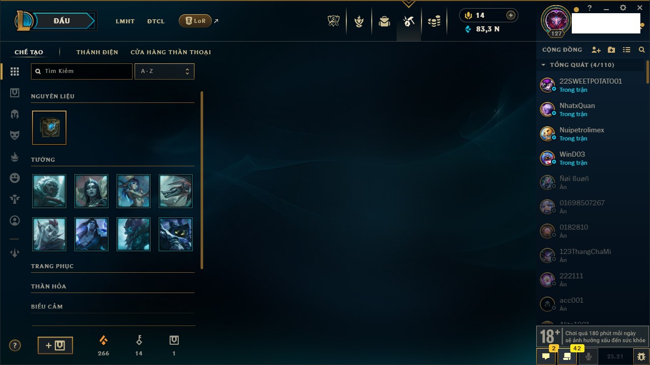 Rank Đơn: Vàng IKhung: BạcTướng: 171 - Còn 60584 THXTrang Phục: 286Rank ĐTCL: Vàng IIILinh Thú: 117