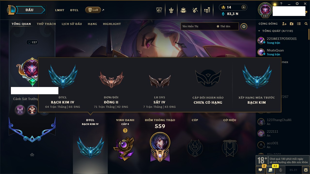 Rank Đơn: Bạch Kim IIKhung: Bạch kimTướng: 171 - Còn 141298 THXTrang Phục: 274Rank ĐTCL: Bạch Kim IILinh Thú: 188