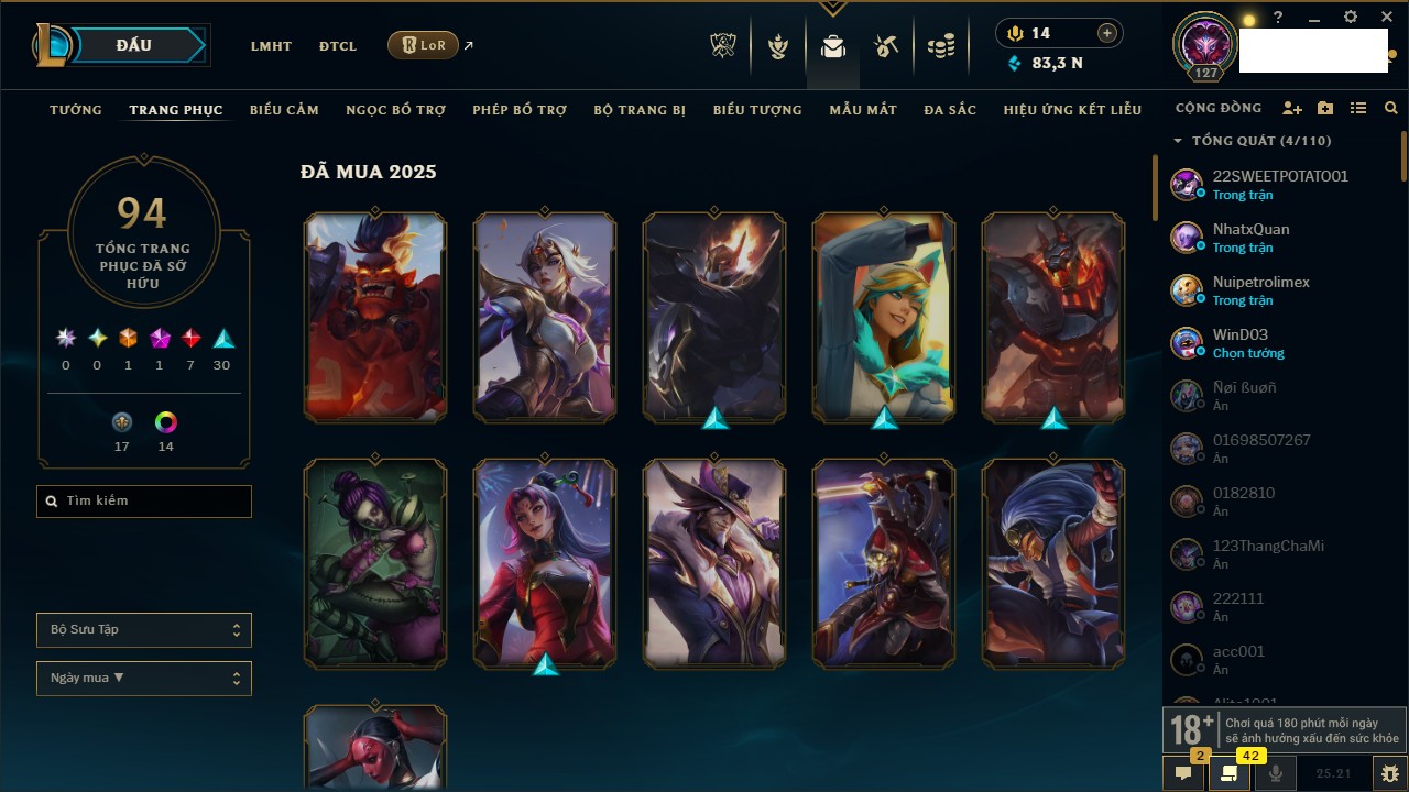 Rank Đơn: Vàng IIIKhung: VàngTướng: 171 - Còn 88128 THXTrang Phục: 329Rank ĐTCL: Chưa RankLinh Thú: 41