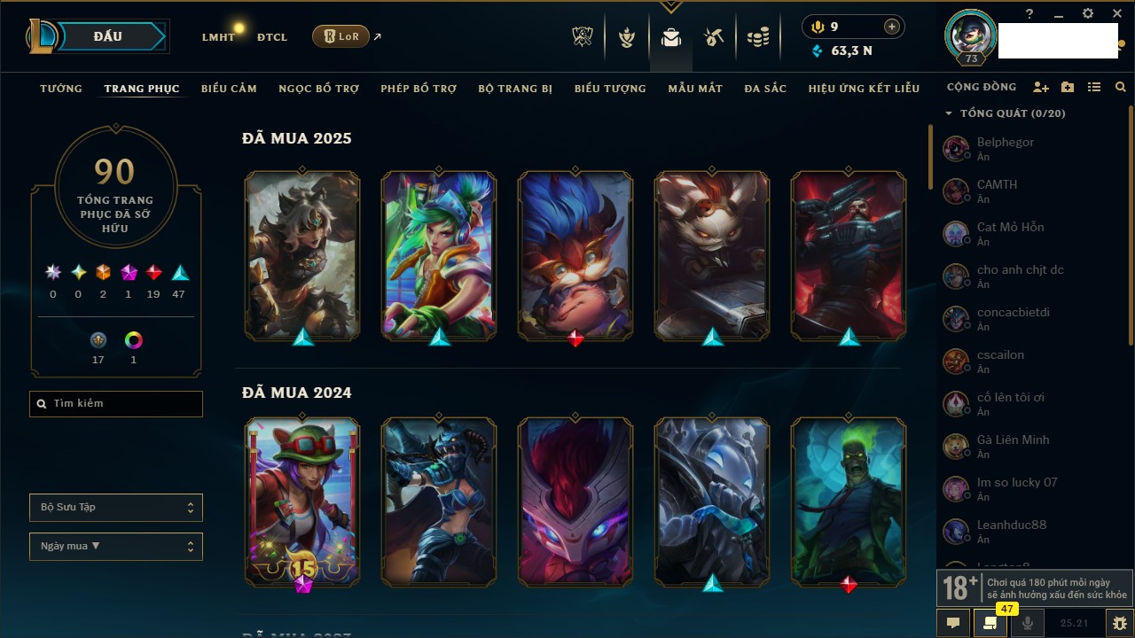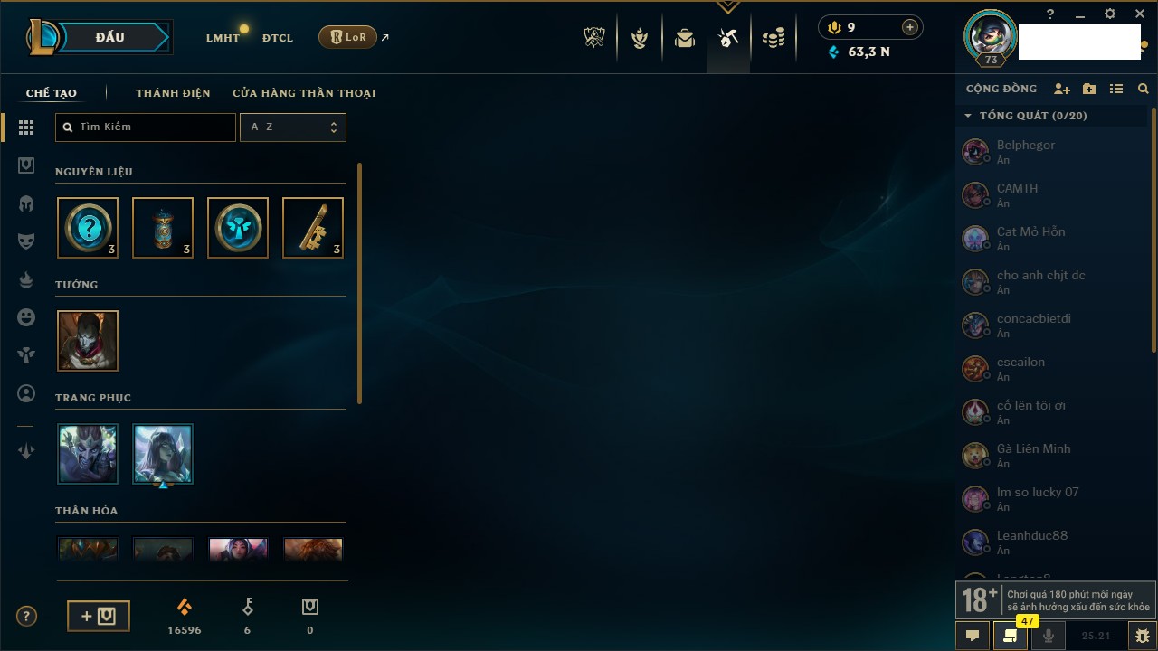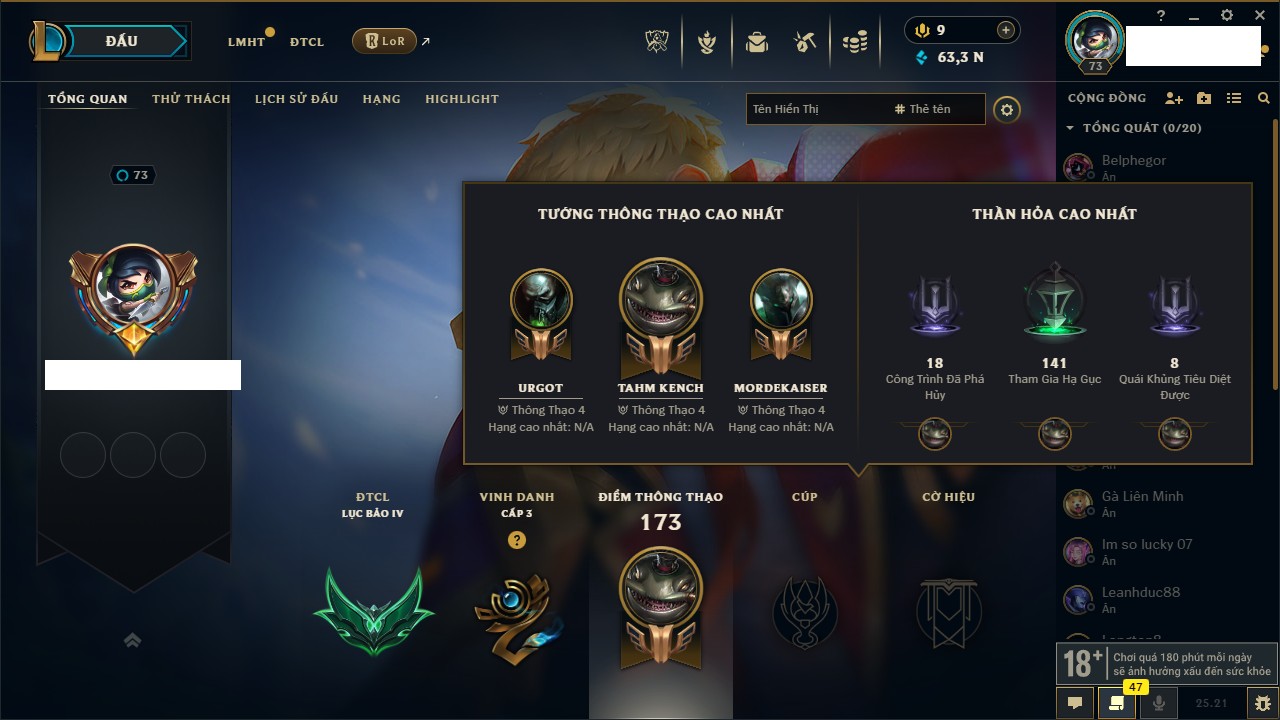Rank Đơn: Vàng IIIKhung: BạcTướng: 171 - Còn 101359 THXTrang Phục: 88Rank ĐTCL: Kim Cương IVLinh Thú: 200