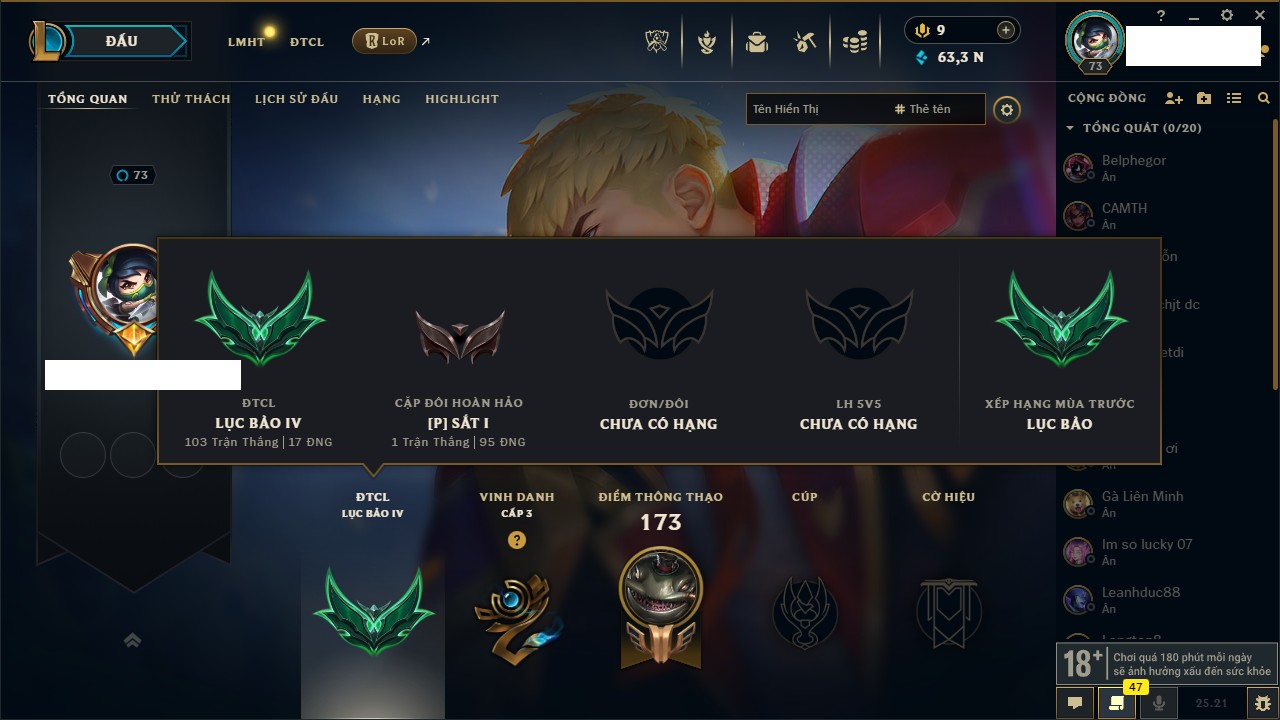 Rank Đơn: Lục Bảo IVKhung: Bạch kimTướng: 171 - Còn 128452 THXTrang Phục: 193Rank ĐTCL: Bạc IIILinh Thú: 100