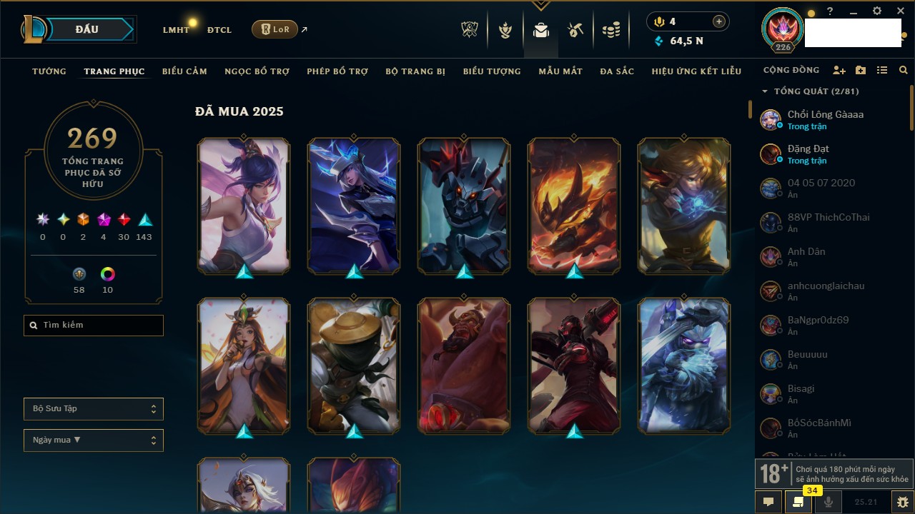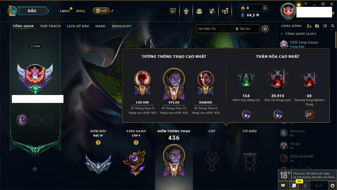 Rank Đơn: Bạch Kim IIKhung: Bạch kimTướng: 171 - Còn 316137 THXTrang Phục: 89Rank ĐTCL: Bạch Kim IIILinh Thú: 94
