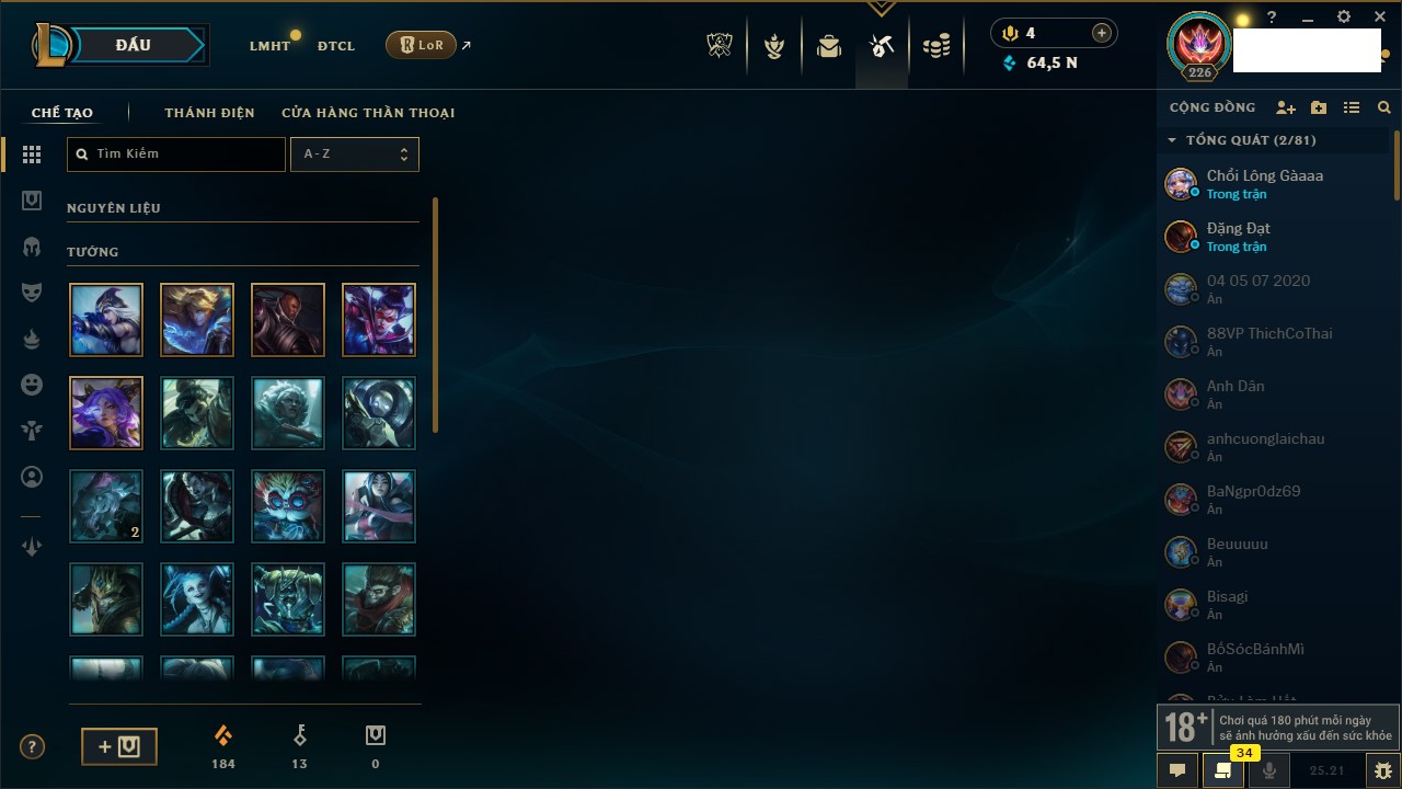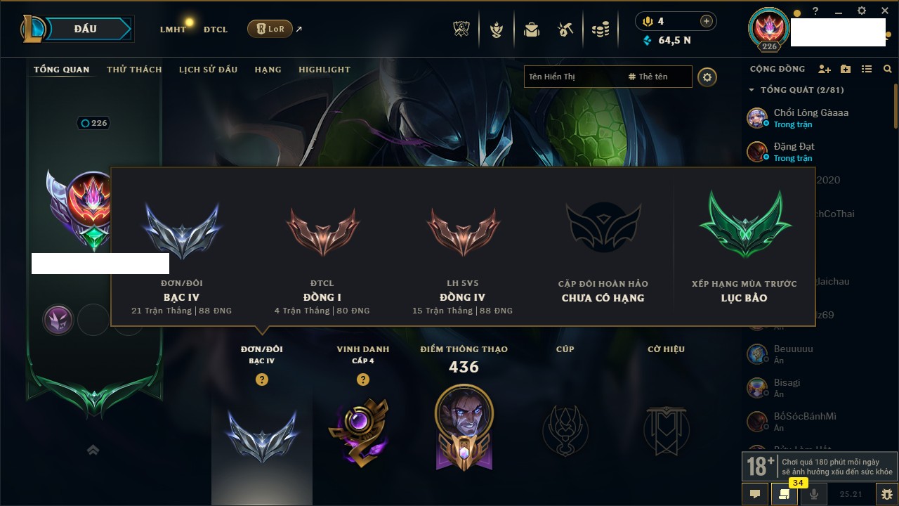Rank Đơn: Lục Bảo IVKhung: VàngTướng: 171 - Còn 154648 THXTrang Phục: 203Rank ĐTCL: Bạch Kim IVLinh Thú: 69