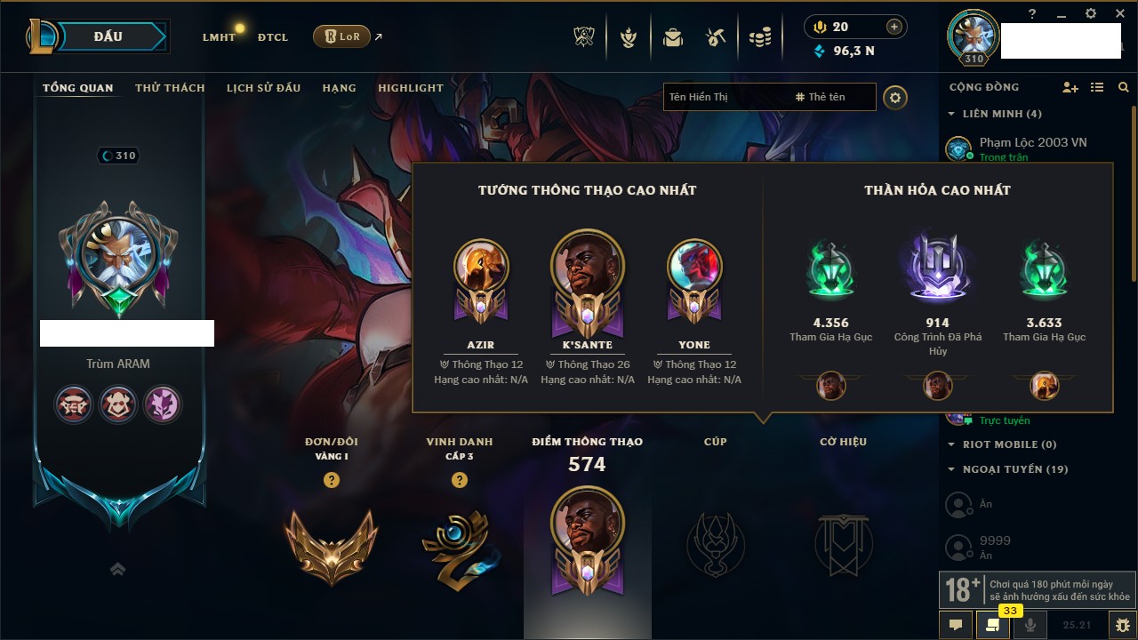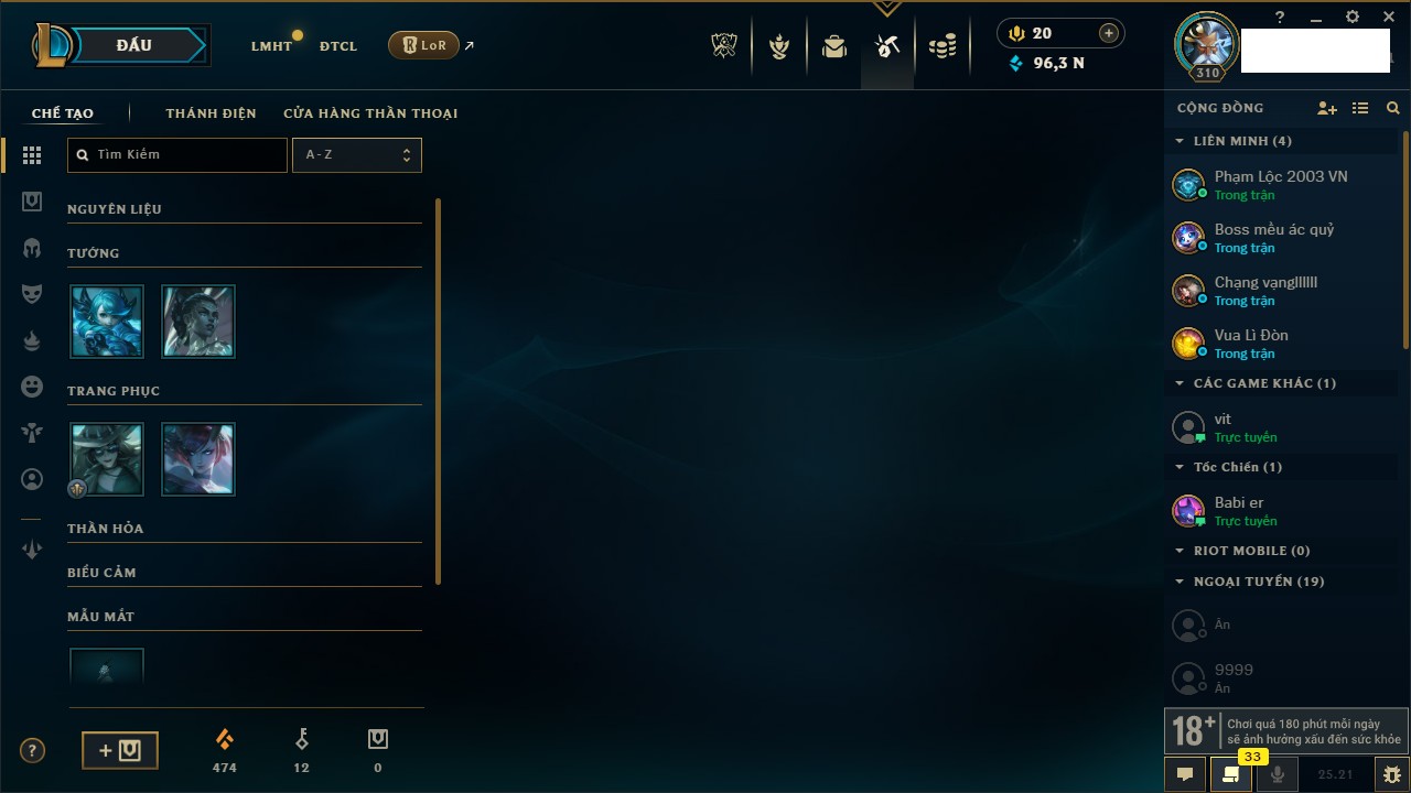 Rank Đơn: Bạc IIIKhung: Chưa có khungTướng: 171 - Còn 21493 THXTrang Phục: 252Rank ĐTCL: Bạch Kim IVLinh Thú: 123