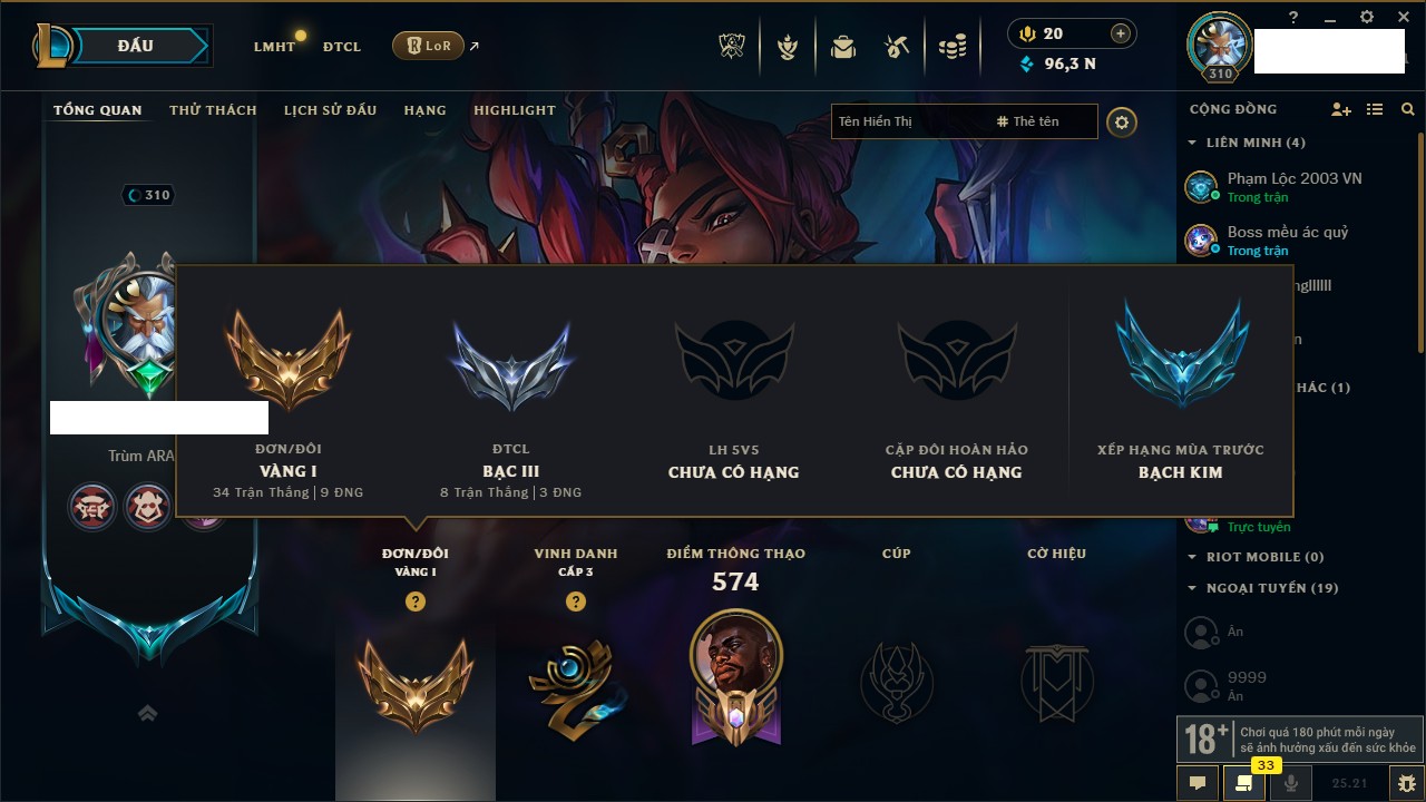 Rank Đơn: Bạch Kim IIIKhung: VàngTướng: 126 - Còn 23055 THXTrang Phục: 114Rank ĐTCL: Chưa RankLinh Thú: 21