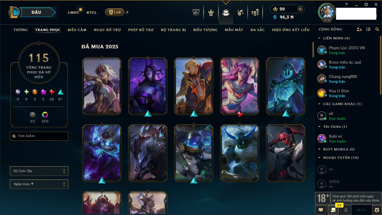 Rank Đơn: Bạc IVKhung: BạcTướng: 171 - Còn 7819 THXTrang Phục: 243Rank ĐTCL: Chưa RankLinh Thú: 102