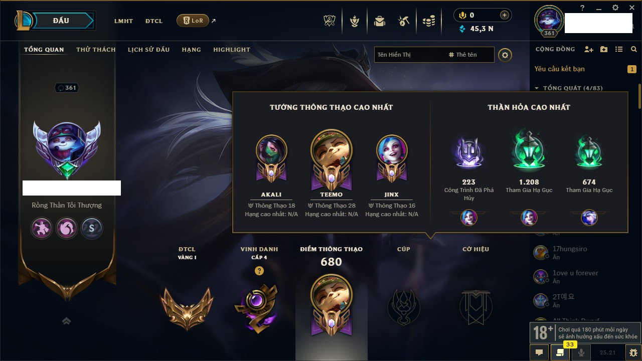 Rank Đơn: Bạc IIIKhung: Chưa có khungTướng: 171 - Còn 21493 THXTrang Phục: 252Rank ĐTCL: Bạch Kim IVLinh Thú: 123