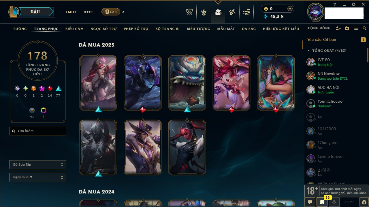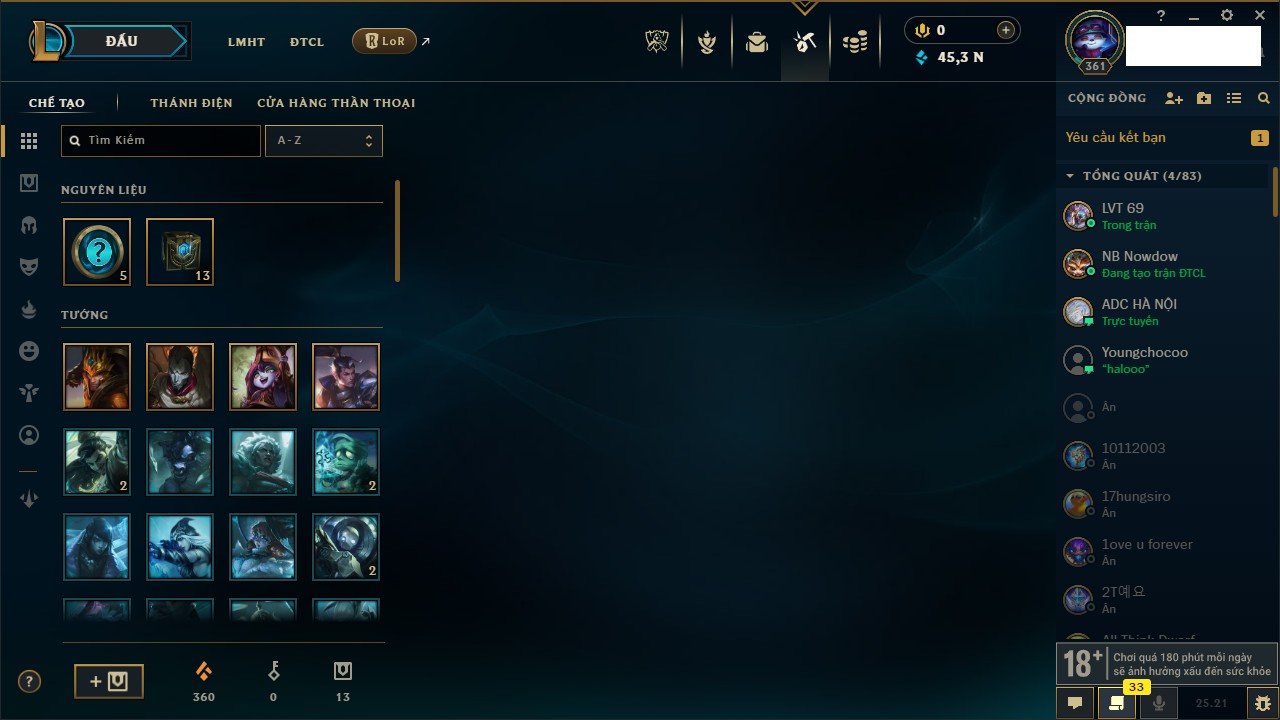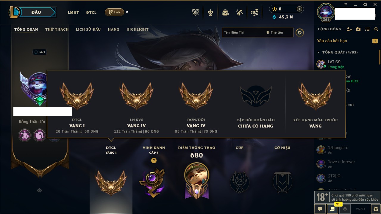 Rank Đơn: Vàng IIKhung: VàngTướng: 171 - Còn 34018 THXTrang Phục: 250Rank ĐTCL: Sắt IILinh Thú: 19
