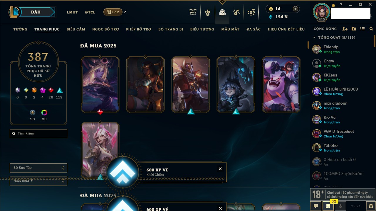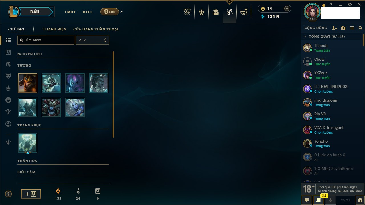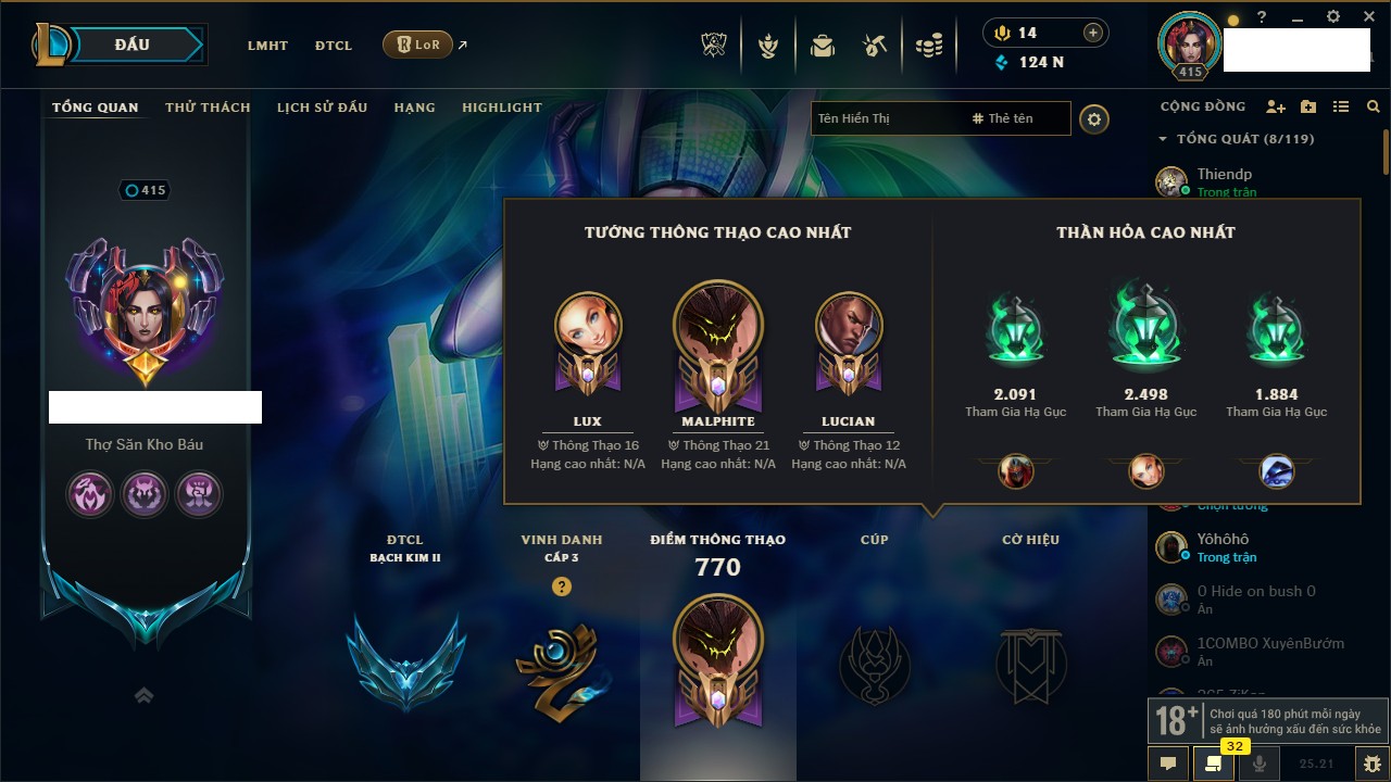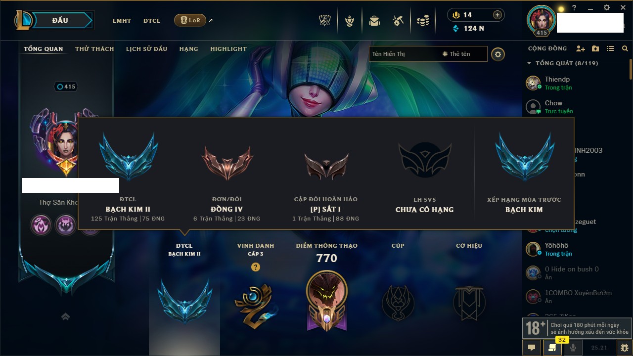 Rank Đơn: Bạch Kim IIIKhung: Bạch kimTướng: 171 - Còn 250924 THXTrang Phục: 355Rank ĐTCL: Chưa RankLinh Thú: 230