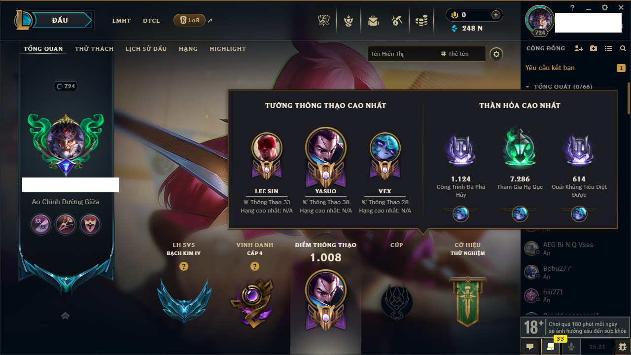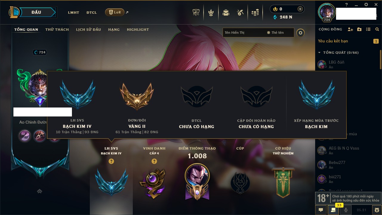 Rank Đơn: Bạch Kim IVKhung: Bạch kimTướng: 172 - Còn 326966 THXTrang Phục: 234Rank ĐTCL: Kim Cương IVLinh Thú: 167
