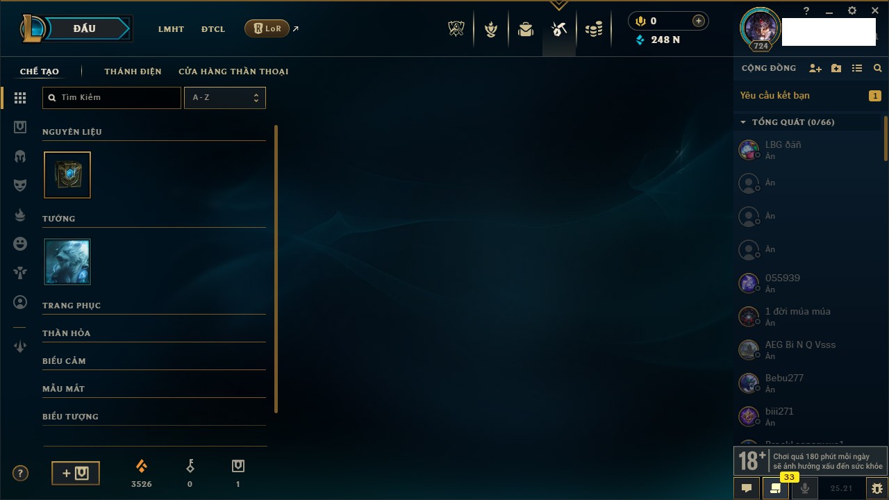 Rank Đơn: Chưa RankKhung: Chưa có khungTướng: 169 - Còn 43188 THXTrang Phục: 205Rank ĐTCL: Chưa RankLinh Thú: 259