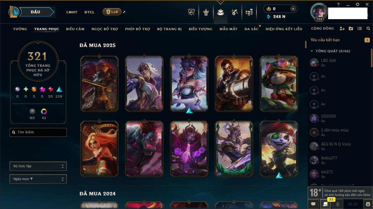 Rank Đơn: Bạc IIKhung: Chưa có khungTướng: 145 - Còn 12230 THXTrang Phục: 183Rank ĐTCL: Chưa RankLinh Thú: 71