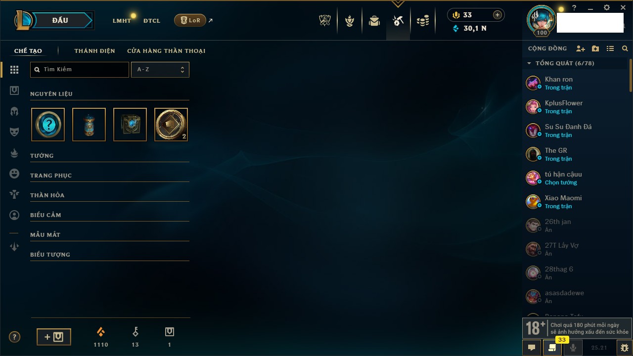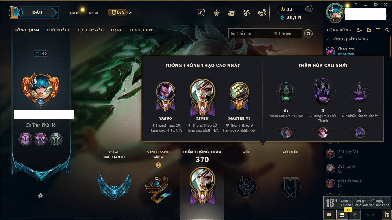 Rank Đơn: Bạch Kim IVKhung: Bạch kimTướng: 171 - Còn 154285 THXTrang Phục: 169Rank ĐTCL: Bạch Kim IILinh Thú: 60