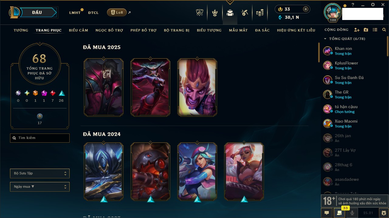Rank Đơn: Vàng IVKhung: VàngTướng: 171 - Còn 48721 THXTrang Phục: 171Rank ĐTCL: Chưa RankLinh Thú: 27