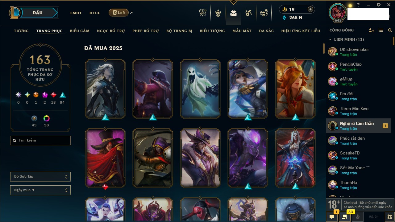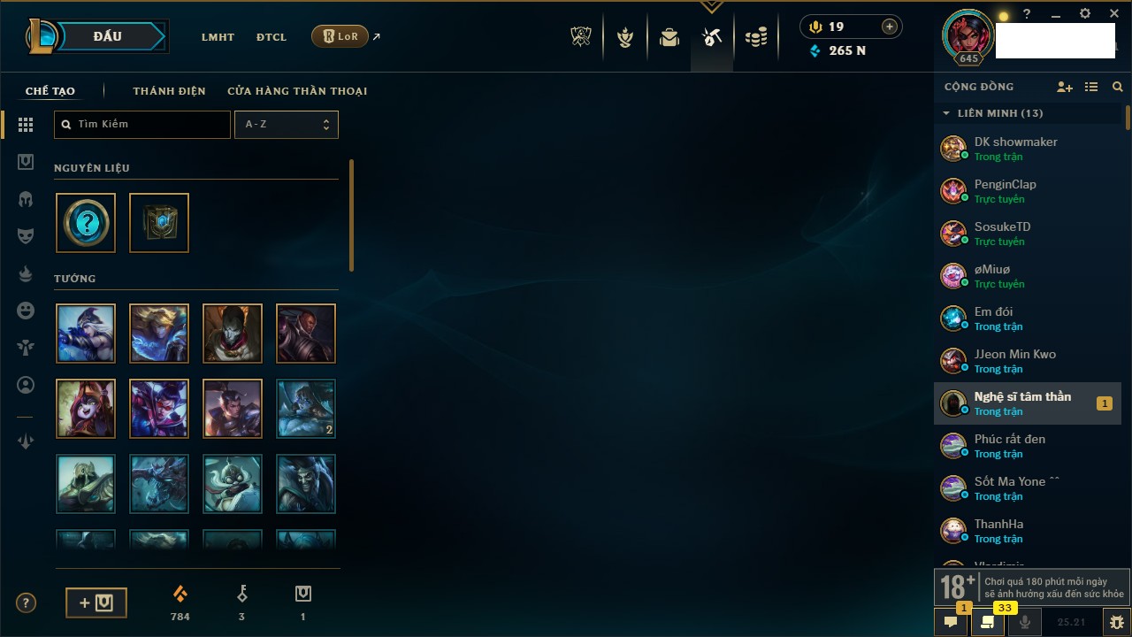 Rank Đơn: Vàng IIIKhung: BạcTướng: 171 - Còn 101359 THXTrang Phục: 88Rank ĐTCL: Kim Cương IVLinh Thú: 200
