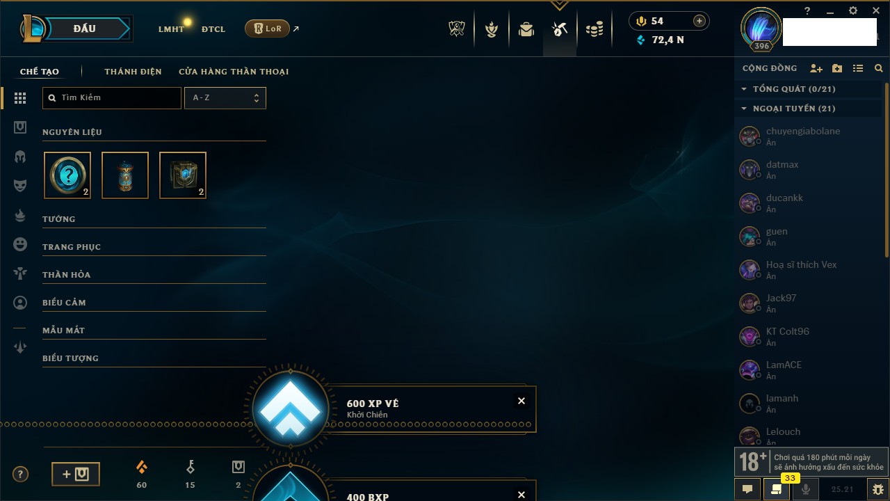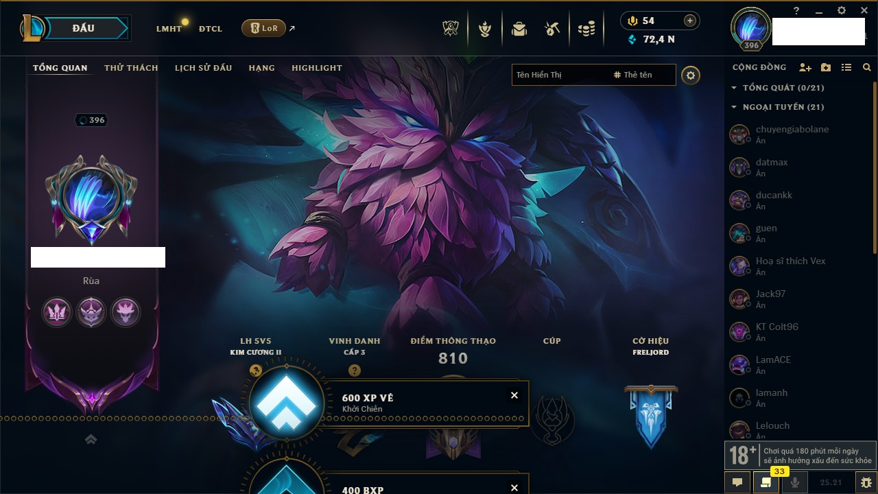 Rank Đơn: Vàng IKhung: BạcTướng: 171 - Còn 60584 THXTrang Phục: 286Rank ĐTCL: Vàng IIILinh Thú: 117