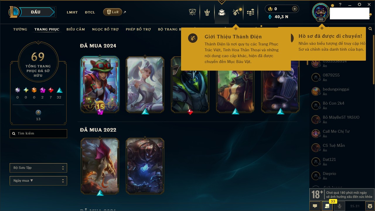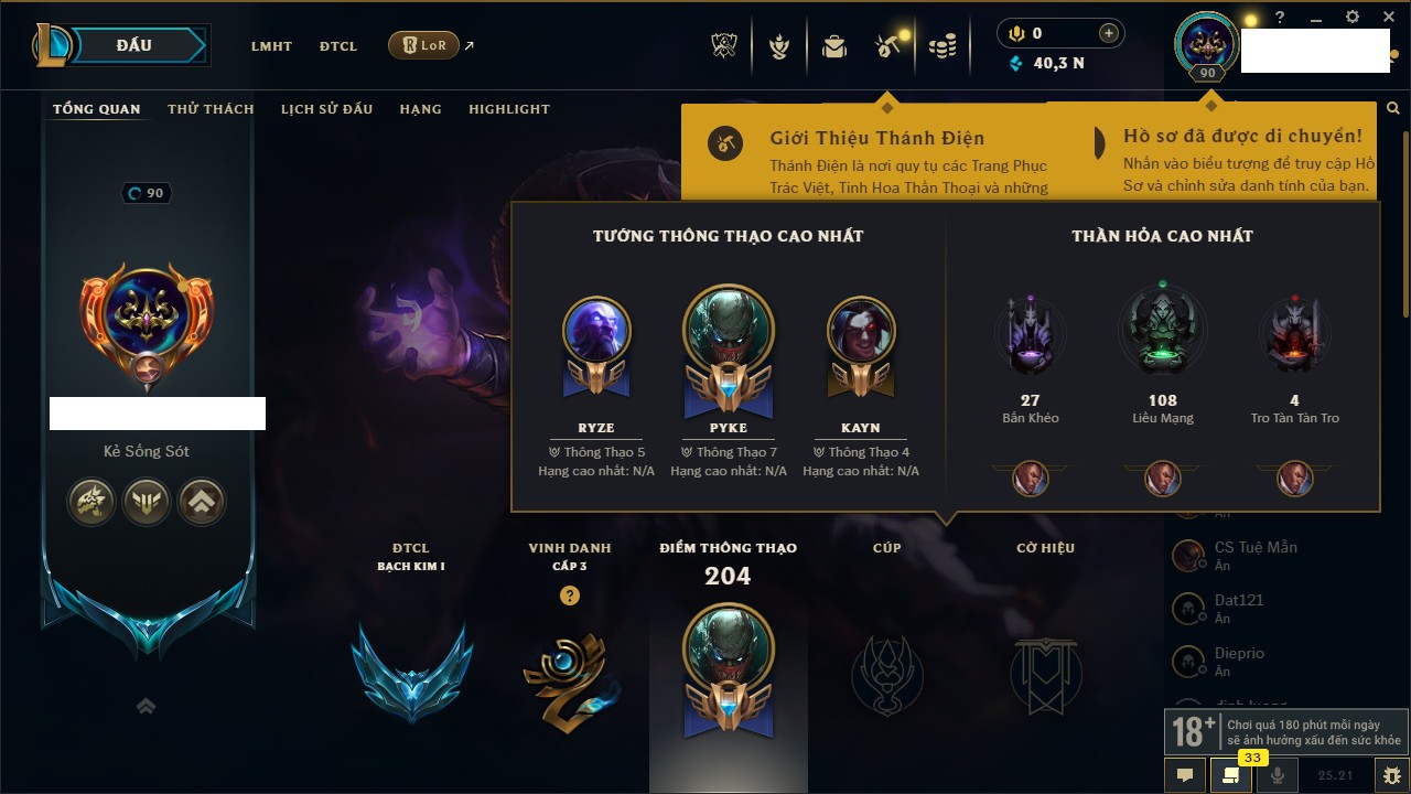 Rank Đơn: Chưa RankKhung: Bạch kimTướng: 172 - Còn 179290 THXTrang Phục: 187Rank ĐTCL: Chưa RankLinh Thú: 49