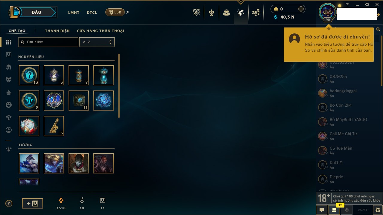 Rank Đơn: Chưa RankKhung: Chưa có khungTướng: 171 - Còn 164047 THXTrang Phục: 173Rank ĐTCL: Chưa RankLinh Thú: 77