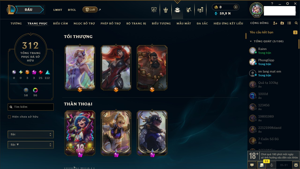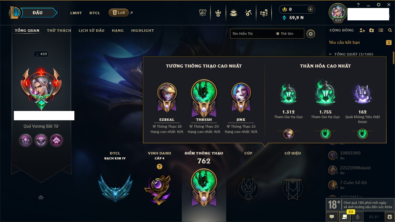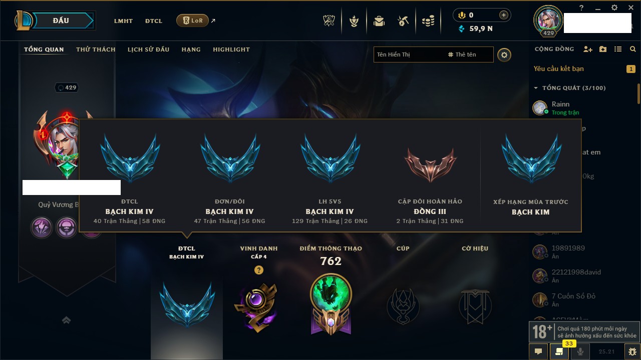 Rank Đơn: Vàng IKhung: Bạch kimTướng: 170 - Còn 212450 THXTrang Phục: 214Rank ĐTCL: Bạch Kim IVLinh Thú: 221