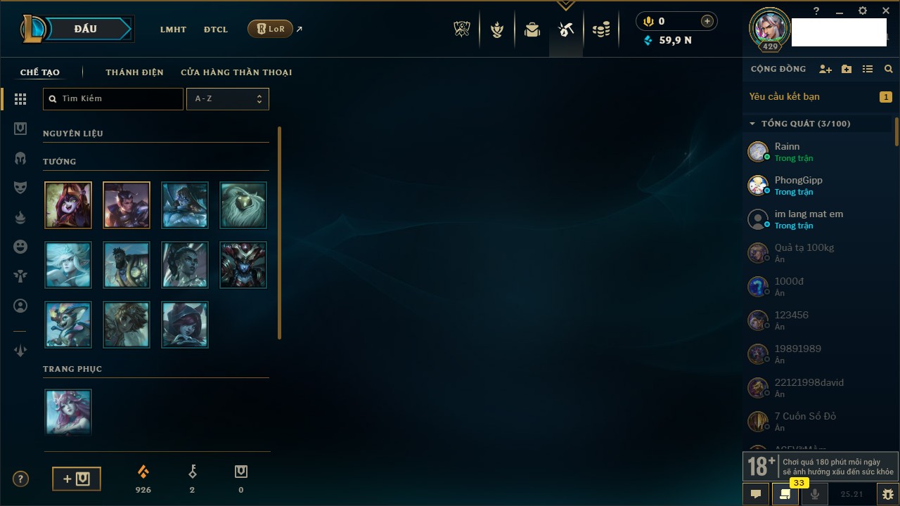 Rank Đơn: Bạch Kim IIKhung: Bạch kimTướng: 171 - Còn 263986 THXTrang Phục: 306Rank ĐTCL: Lục Bảo IVLinh Thú: 96