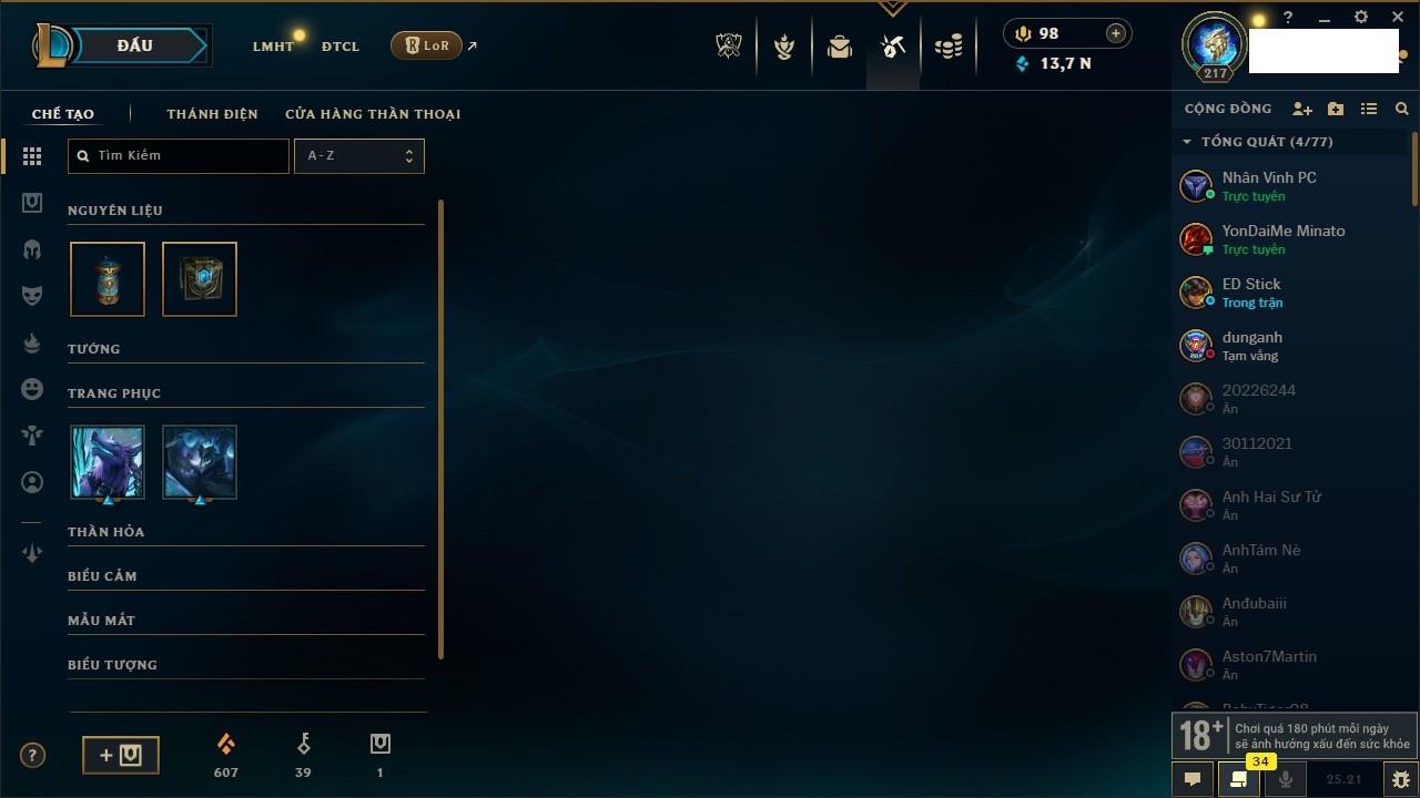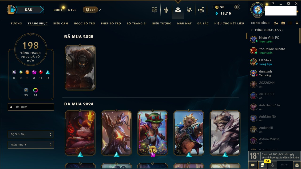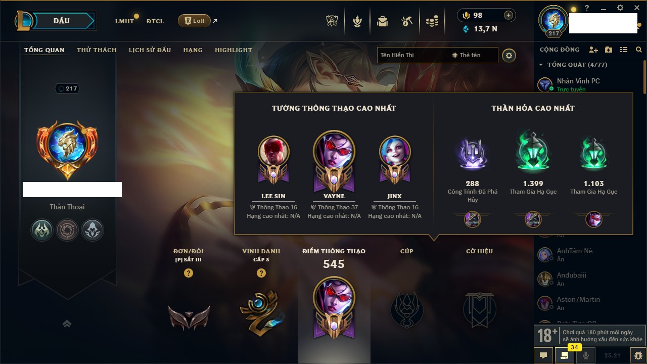 Rank Đơn: Bạch Kim IIKhung: Bạch kimTướng: 171 - Còn 316137 THXTrang Phục: 89Rank ĐTCL: Bạch Kim IIILinh Thú: 94