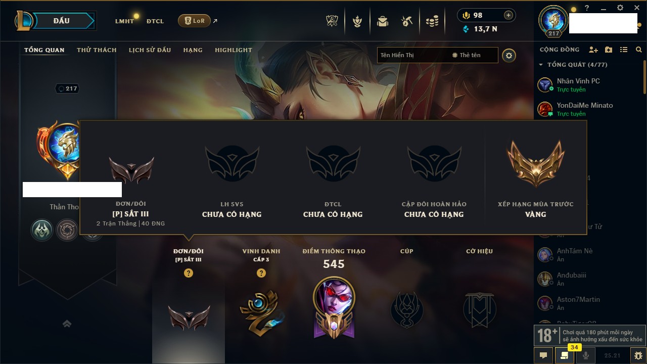 Rank Đơn: Lục Bảo IVKhung: VàngTướng: 171 - Còn 154648 THXTrang Phục: 203Rank ĐTCL: Bạch Kim IVLinh Thú: 69