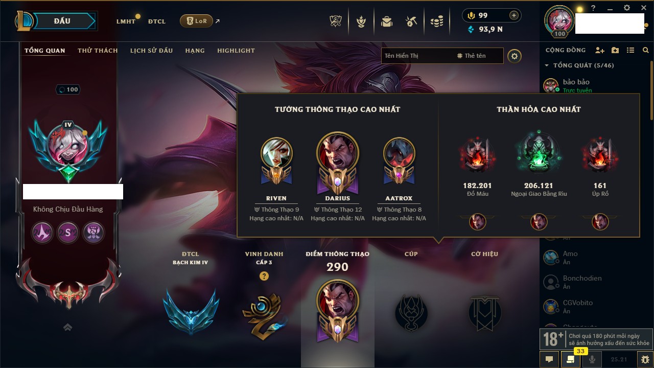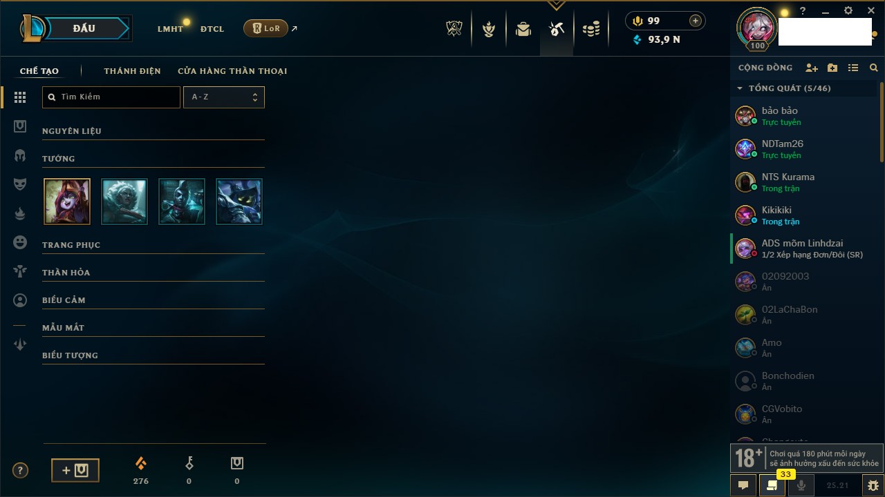 Rank Đơn: Sắt IKhung: Chưa có khungTướng: 171 - Còn 89600 THXTrang Phục: 513Rank ĐTCL: Chưa RankLinh Thú: 57
