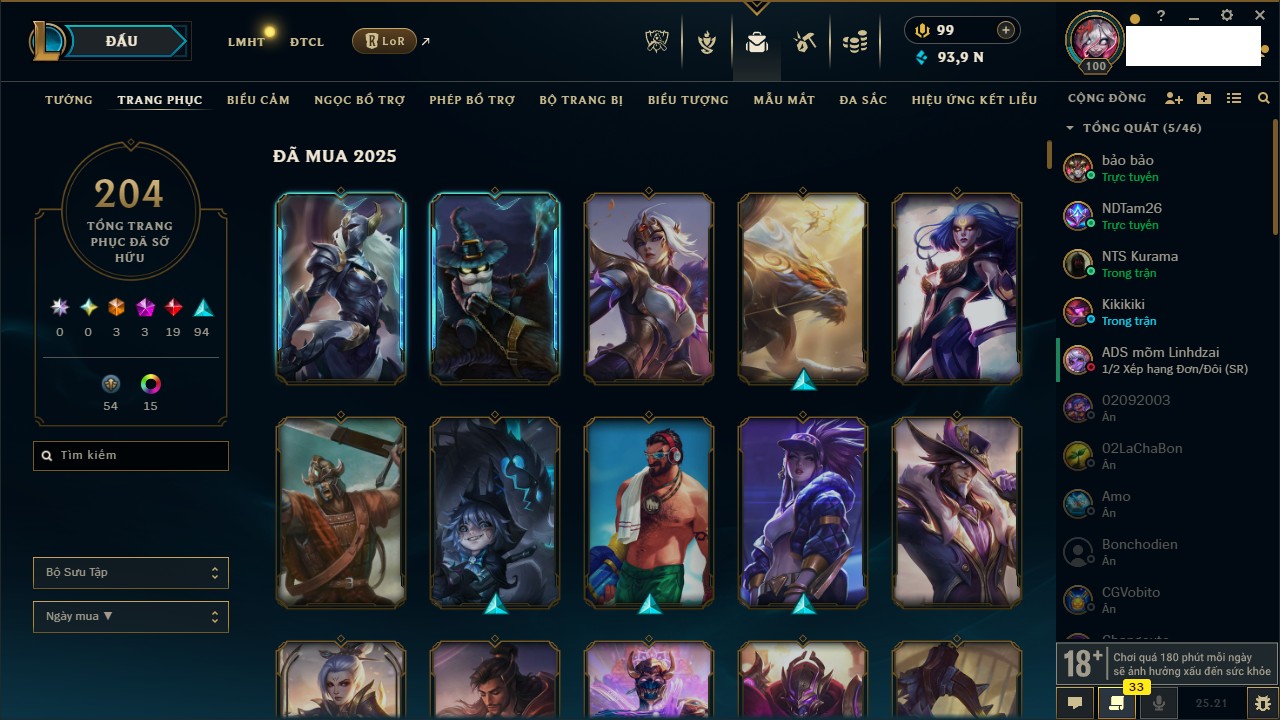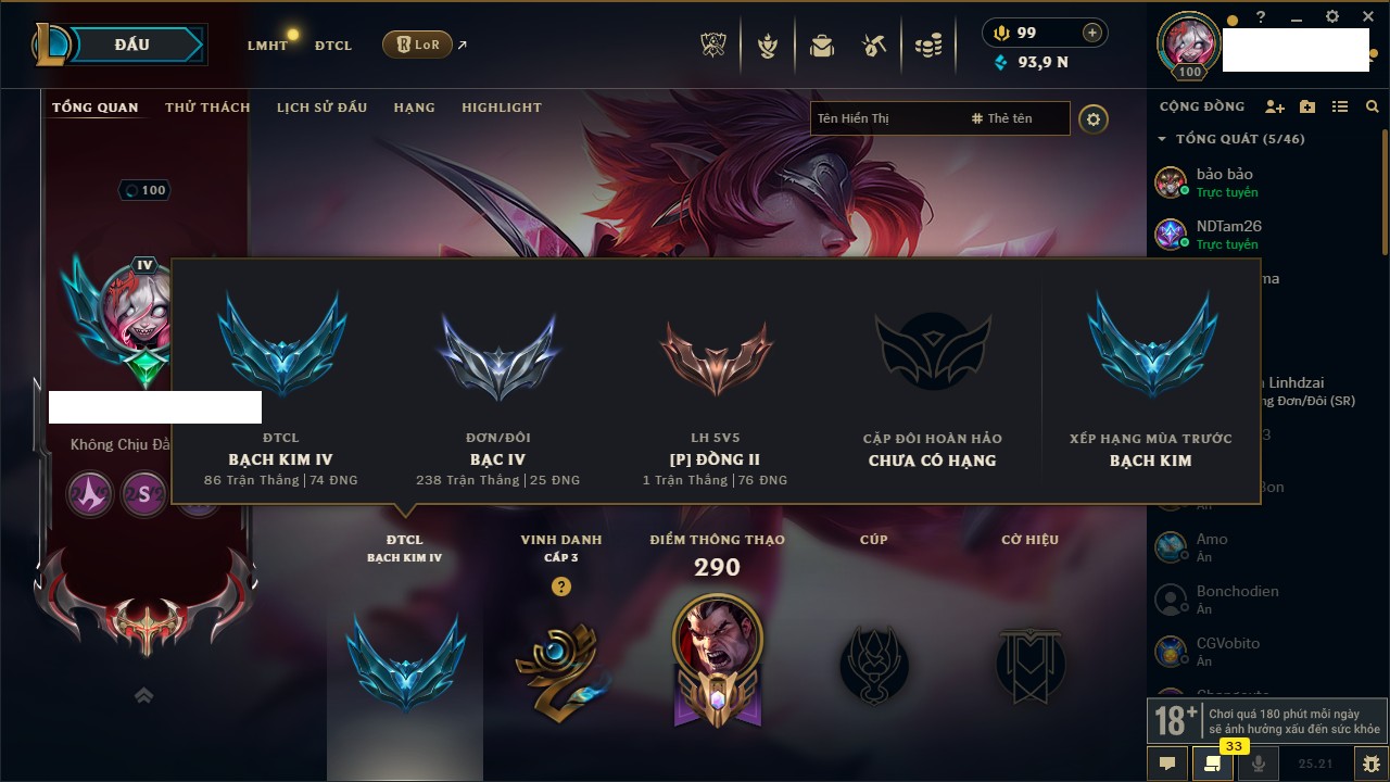 Rank Đơn: Chưa RankKhung: Chưa có khungTướng: 170 - Còn 72514 THXTrang Phục: 202Rank ĐTCL: Chưa RankLinh Thú: 191