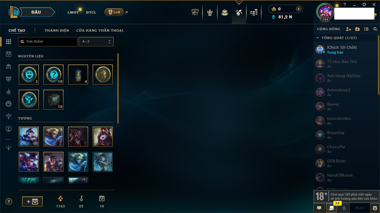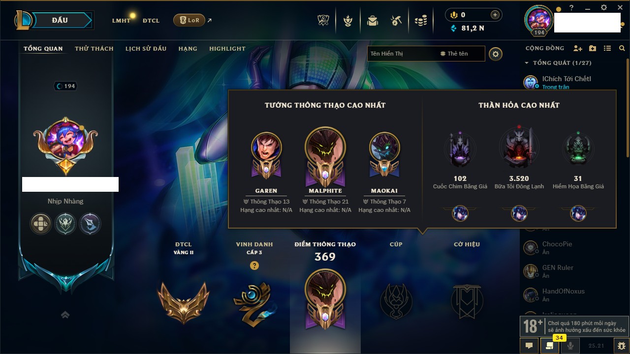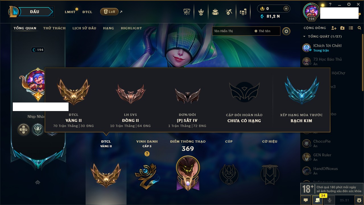 Rank Đơn: Vàng IIIKhung: BạcTướng: 171 - Còn 101359 THXTrang Phục: 88Rank ĐTCL: Kim Cương IVLinh Thú: 200