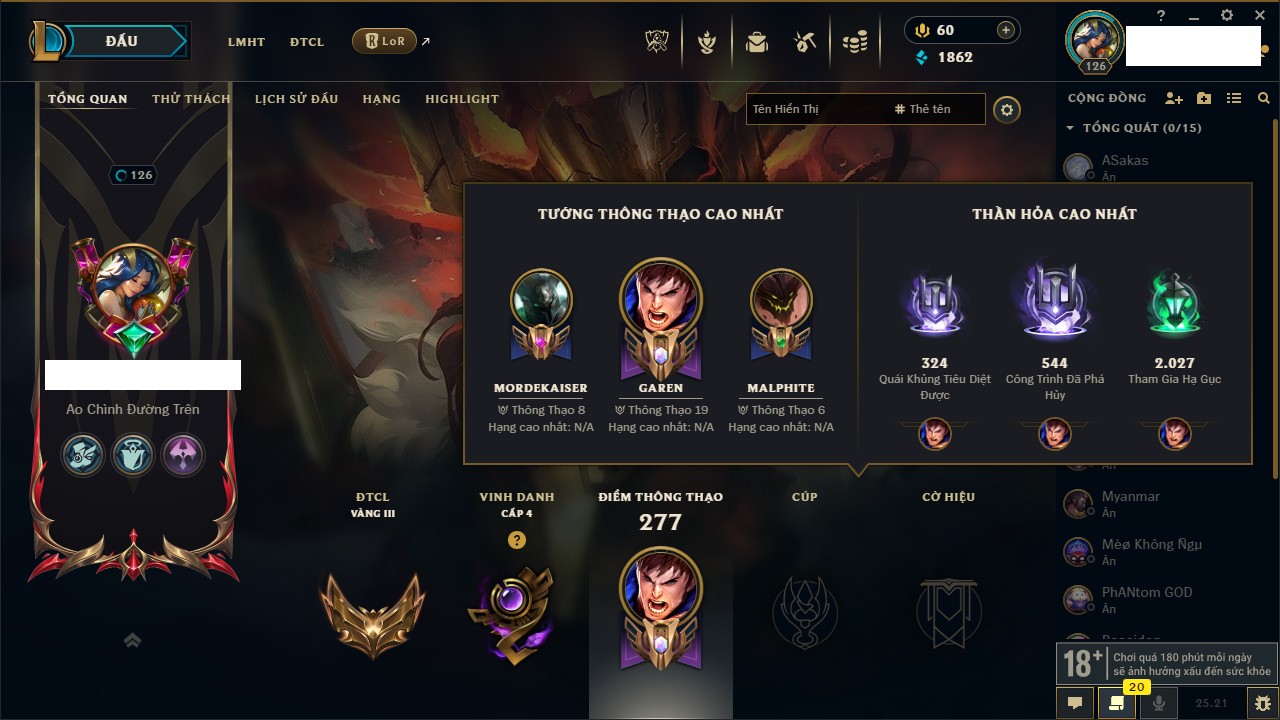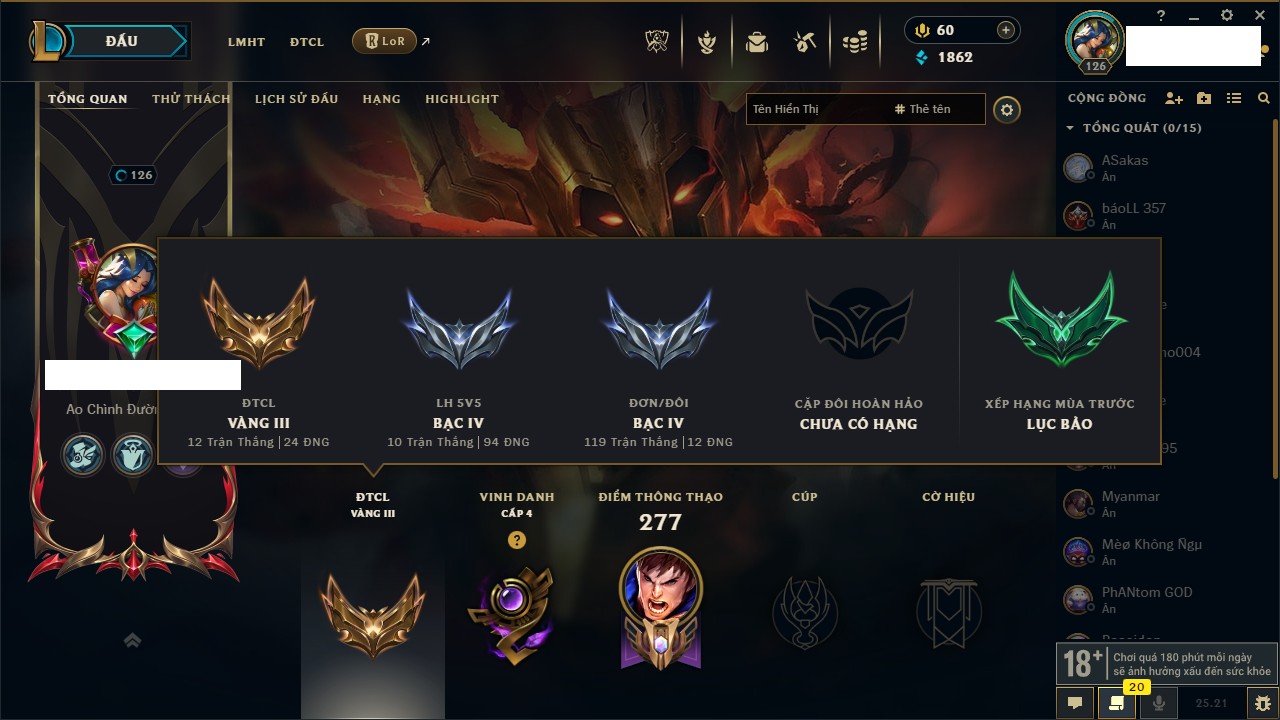Rank Đơn: Bạch Kim III Khung: Bạch kim Tướng: 171 - Còn 79166 THX Trang Phục: 441 Rank ĐTCL: Bạc IV Linh Thú: 354