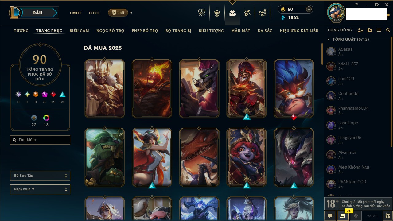 Rank Đơn: Chưa rank mùa nào Khung: Chưa có khung Tướng: 16 - Còn 25584 THX Trang Phục: 3 Rank ĐTCL: Bạch Kim IV Linh Thú: 155