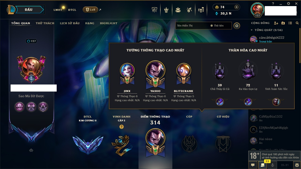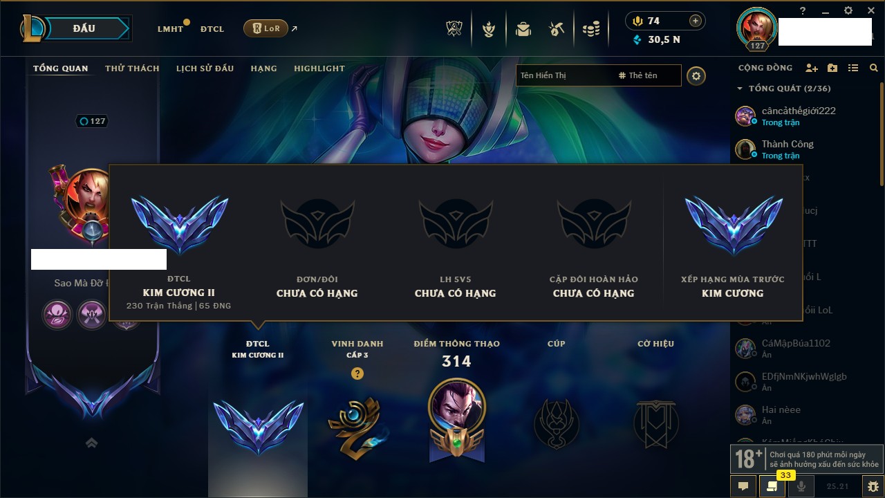 Rank Đơn: Bạch Kim IVKhung: Bạch kimTướng: 172 - Còn 326966 THXTrang Phục: 234Rank ĐTCL: Kim Cương IVLinh Thú: 167