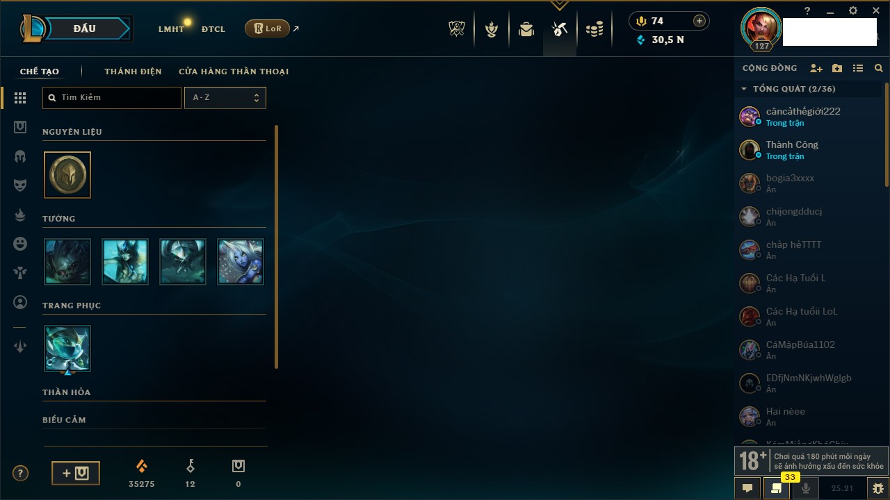 Rank Đơn: Chưa RankKhung: Chưa có khungTướng: 169 - Còn 43188 THXTrang Phục: 205Rank ĐTCL: Chưa RankLinh Thú: 259
