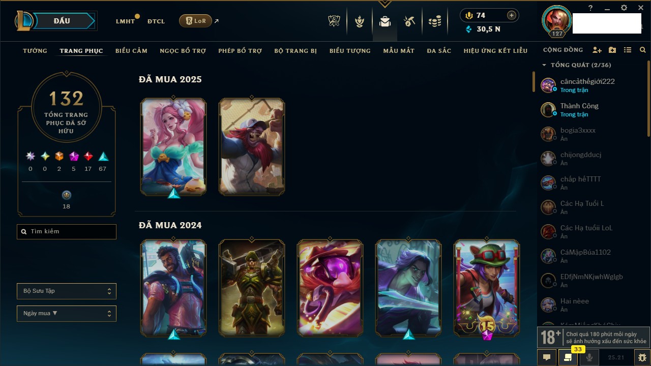 Rank Đơn: Bạc IIKhung: Chưa có khungTướng: 145 - Còn 12230 THXTrang Phục: 183Rank ĐTCL: Chưa RankLinh Thú: 71
