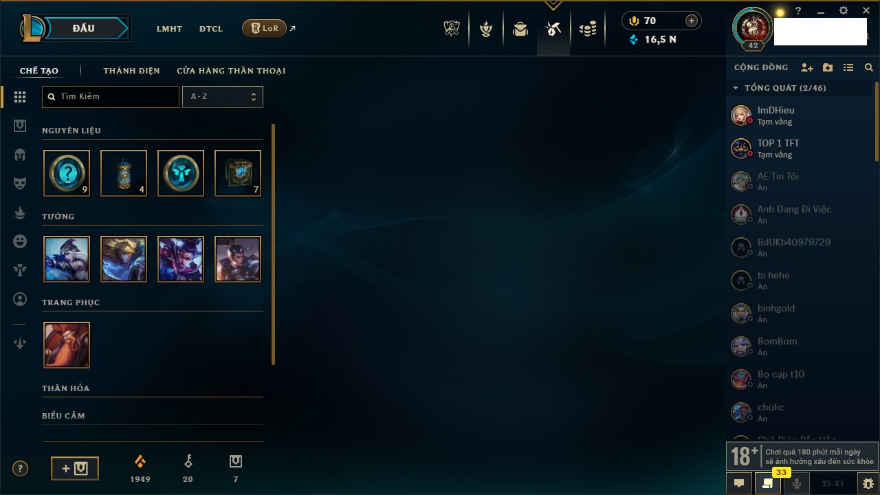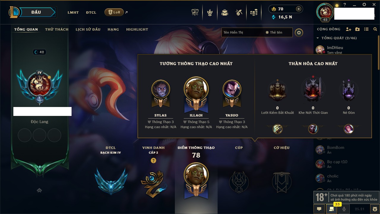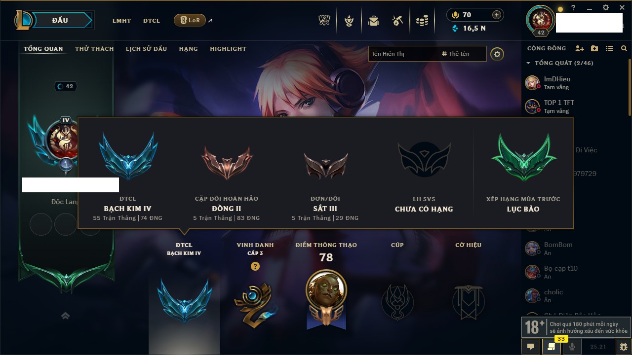 Rank Đơn: Bạch Kim IVKhung: VàngTướng: 171 - Còn 130280 THXTrang Phục: 226Rank ĐTCL: Kim Cương IVLinh Thú: 183