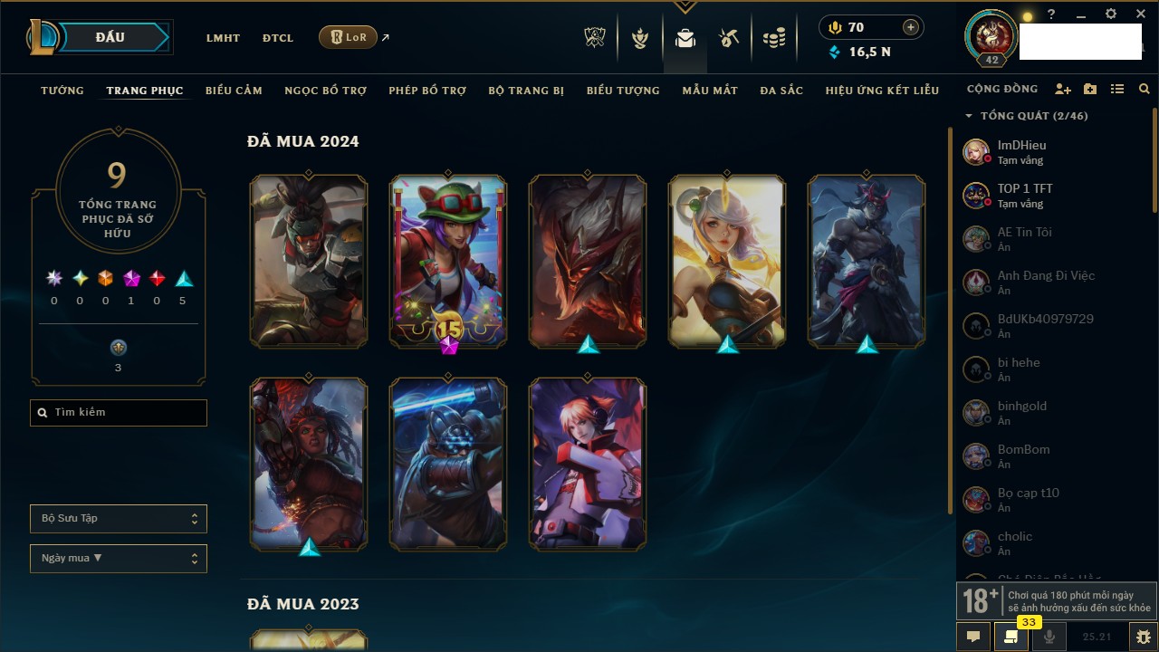 Rank Đơn: Vàng IIKhung: VàngTướng: 171 - Còn 219803 THXTrang Phục: 254Rank ĐTCL: Chưa RankLinh Thú: 78
