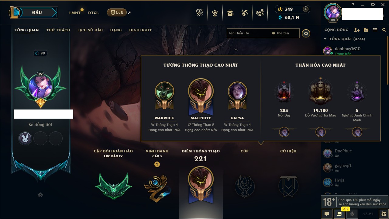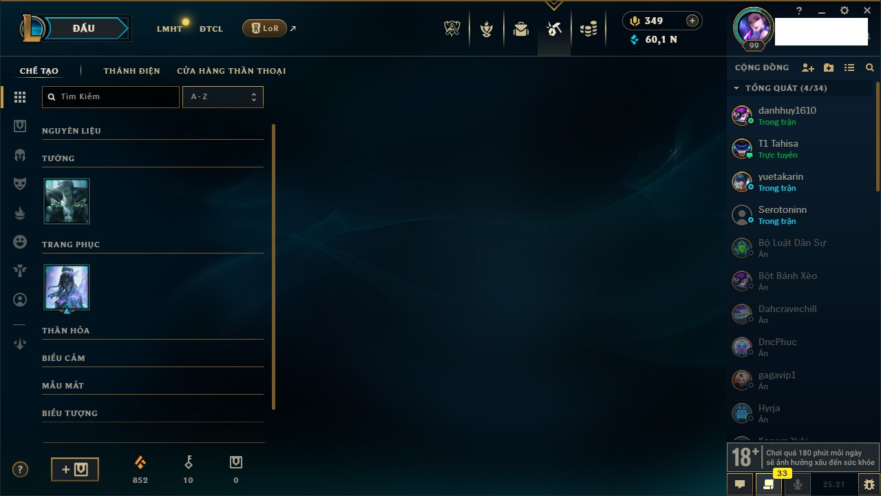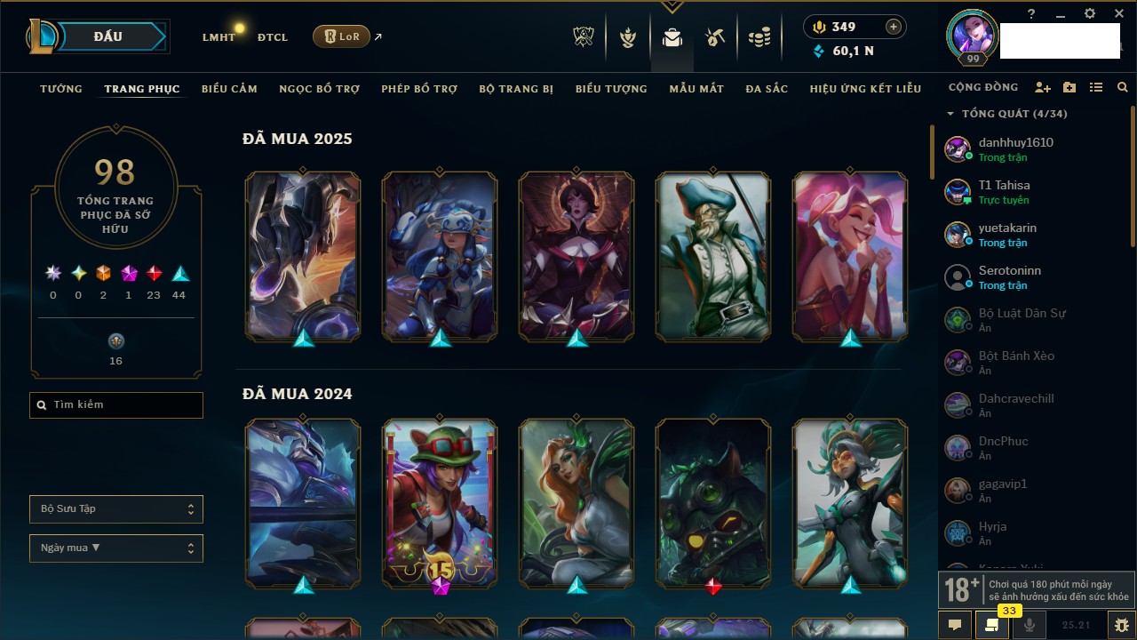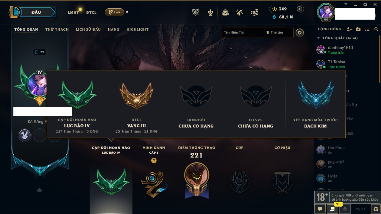 Rank Đơn: Bạc IIKhung: Bạch kimTướng: 169 - Còn 81813 THXTrang Phục: 301Rank ĐTCL: Chưa RankLinh Thú: 140